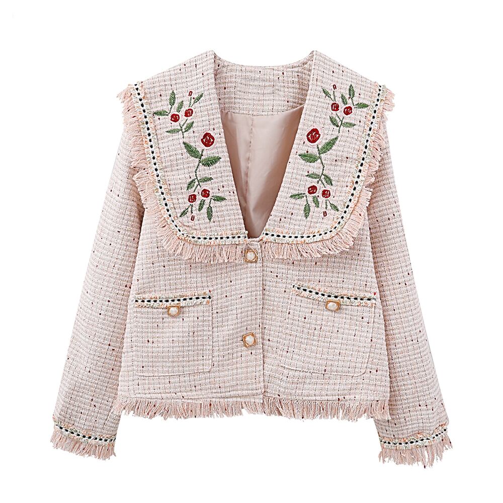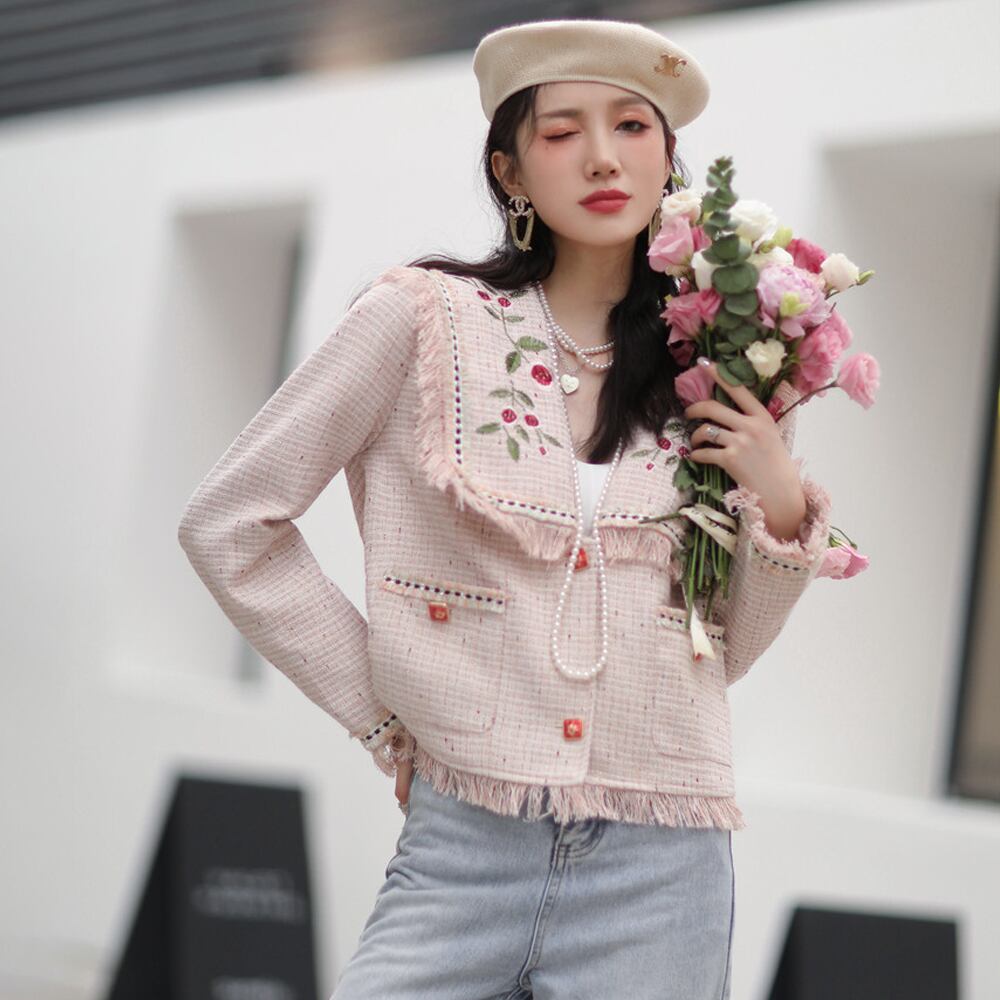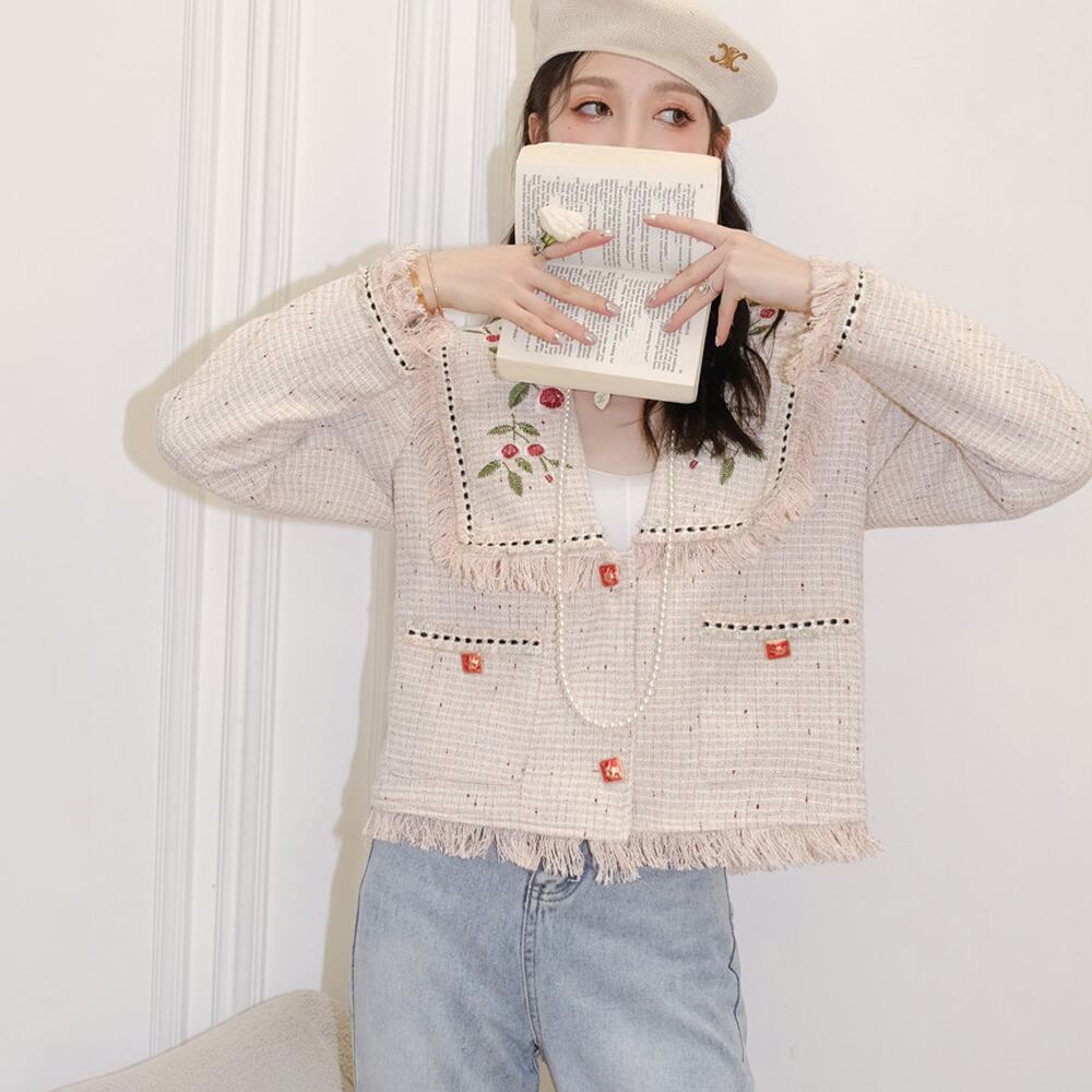 ダスティピンク フリンジツイードジャケット 刺繍 薔薇の刺繍 変わりボタン 長袖 春ジャケット 前ボタン シングルボタン 襟あり ビッグカラー 襟大きめ セーラー襟 シングルブレスト ショートジャケット ツイード フリンジ フラワー刺繍 フランス刺しゅう 体型カバー ロング ロング丈 ナチュラル フレア かわいい 大人可愛い カジュアル 大人 おしゃれ 大人可愛い 無地 春 夏 レディース デート 通勤 通学 オフィス 旅行 普段使い ピンクベージュ 薄ピンク 韓国コーデ 韓国ファッション