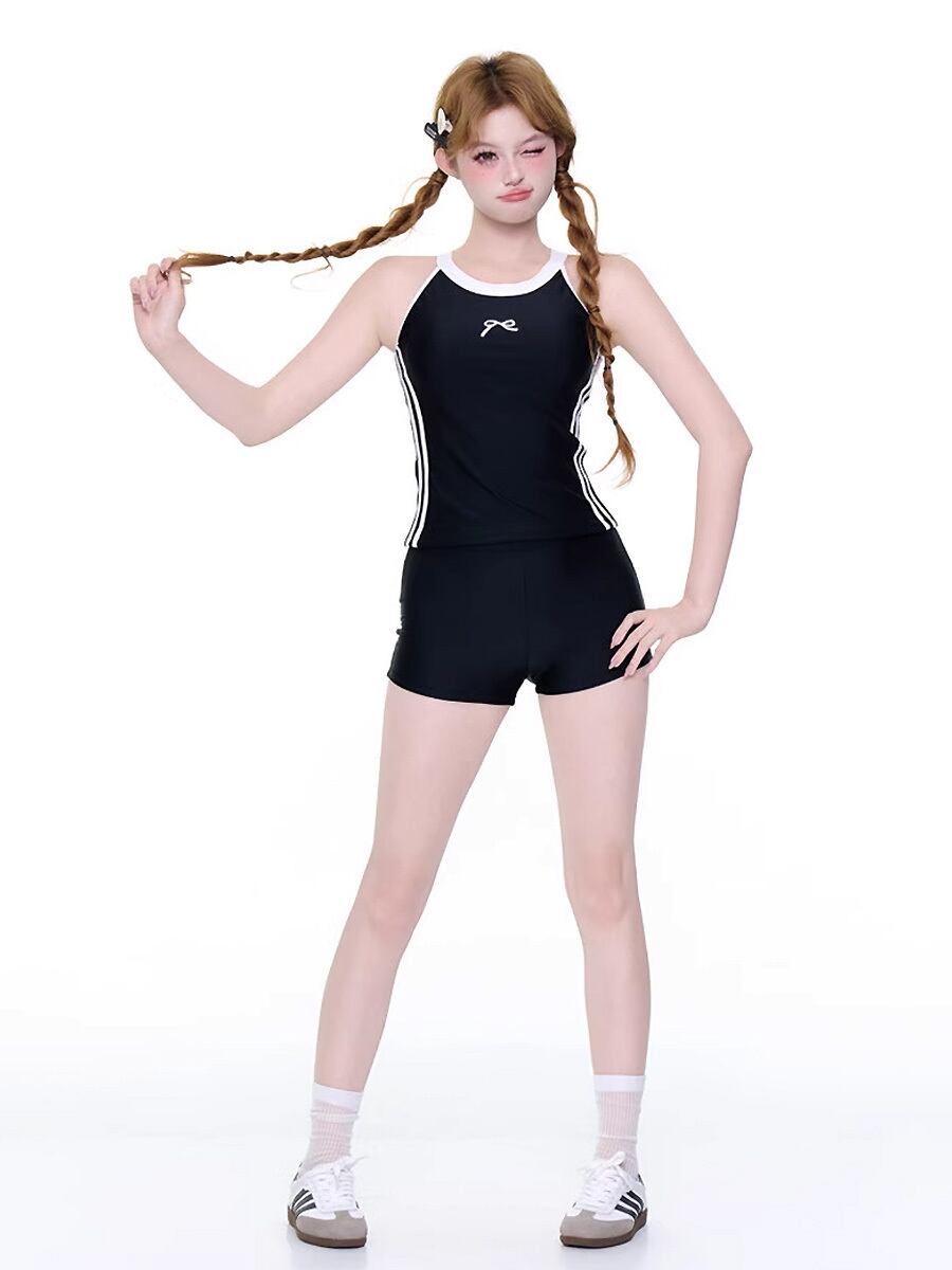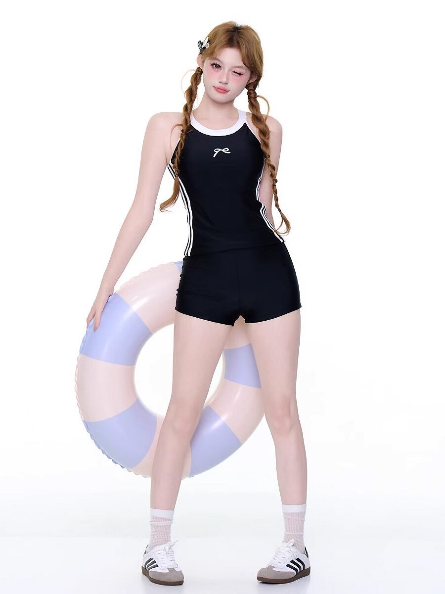 水着 セパレート サイドラインウエスト細見えツーピース水着 セパレート水着 ボーイレッグパンツ ウエスト細見せ ウエスト細見え ライン入り サイドライン リボンプリント 切り替えデザイン 露出度少なめ ハイウエスト かわいい 大人可愛い ラブリー キュート ブラック 温泉 レディース ツーピース 海 ビーチ プール リゾート スパ スポーツクラブ 水遊び 美脚 脚長 着痩せ 韓国系 オルチャン オルチャン 韓国コーデ 韓国ファッション 黒 ブラック