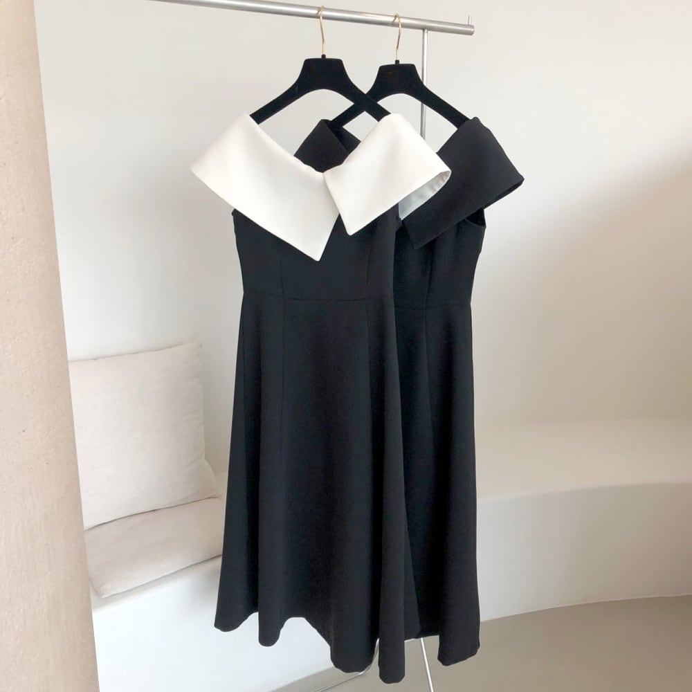 全2色 アシンメトリービッグカラーワンピース ノースリーブ フレンチスリープ ロング タイトワンピース ラウンドネック ワンピ ミディ丈 膝下 バイカラー きちんと感 きれいめ フレア Aライン エレガント お嬢様 個性的 レディース デート お出かけ 女子会 リゾート 旅行 ホテル ガーデン 韓国ファッション 韓国コーデ 黒 ブラック 白 ホワイト 結婚式 上品 同窓会