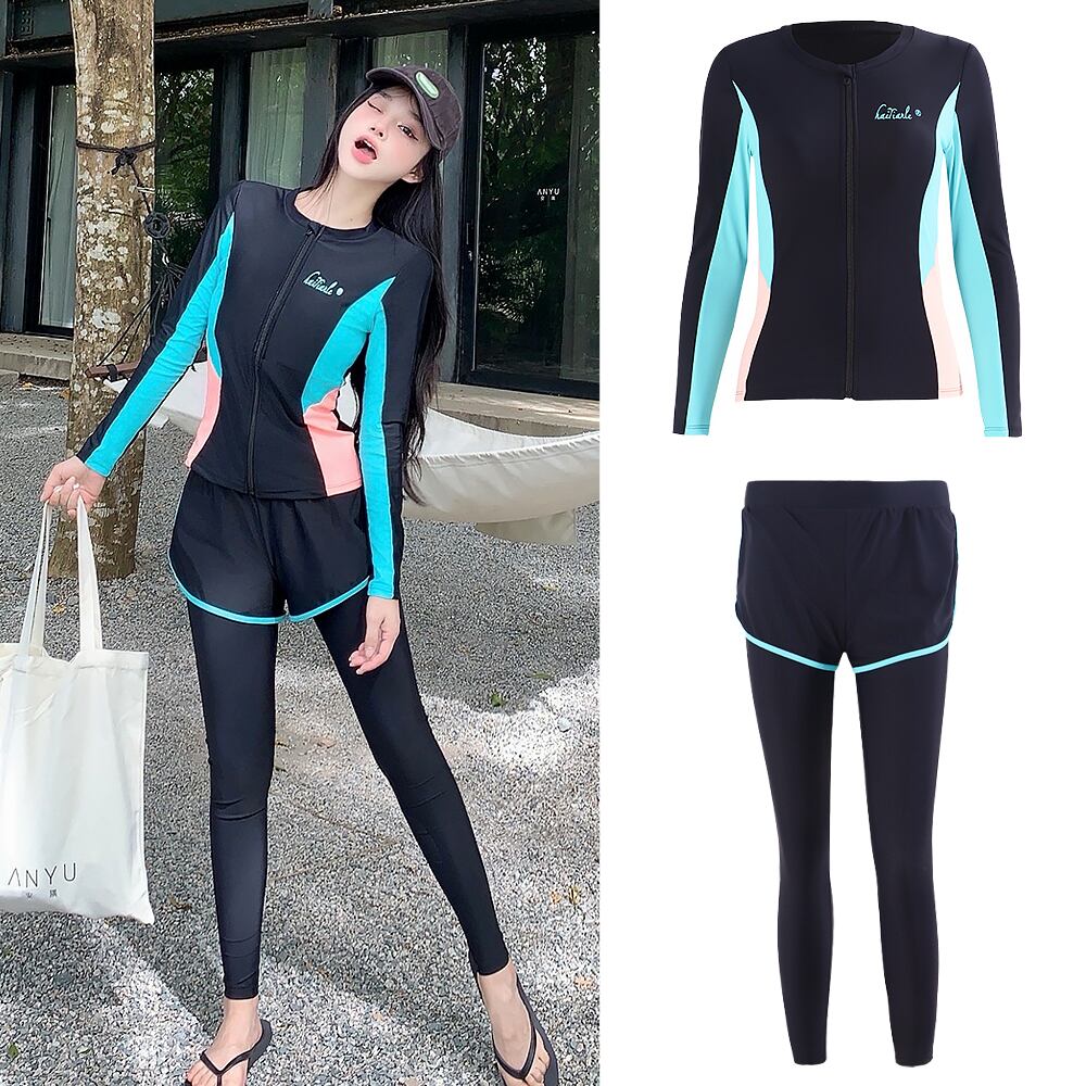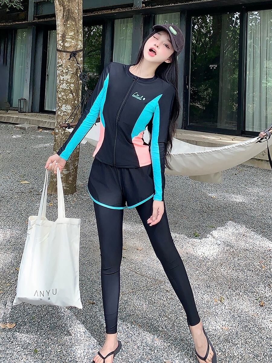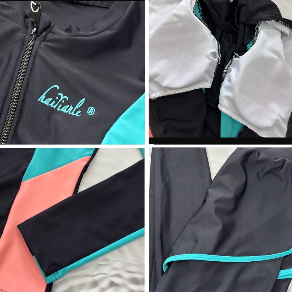 フルジップの長袖トップスとショートパンツがドッキングされたロングパンツのツーピース水着です。