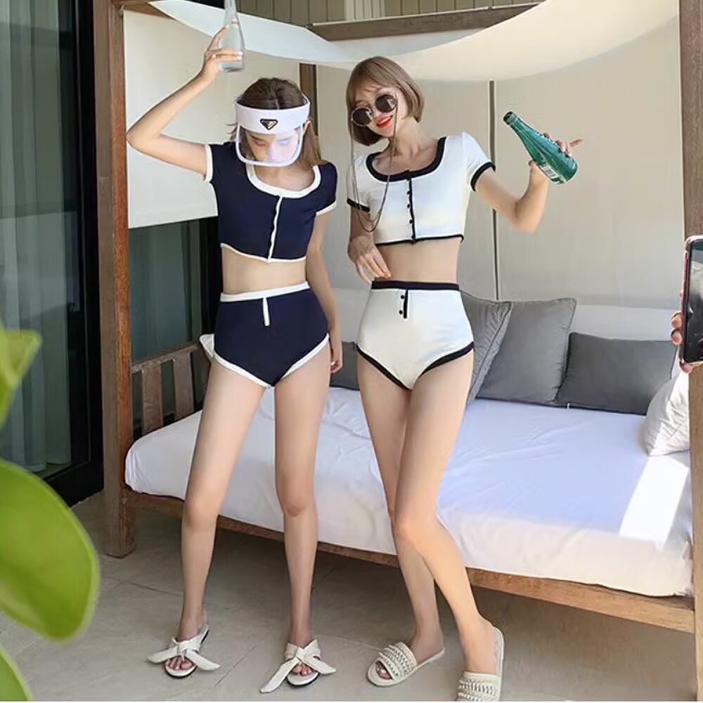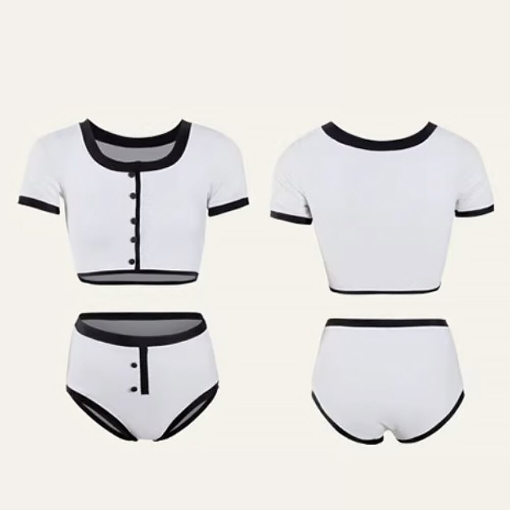 全2色 水着 袖付きバイカラーハイウエストタンキニ ビキニ 半袖 パイピング ポタン 下腹カバー かわいい 大人可愛い きれいめ セクシー sexy シンプル カジュアル ナチュラル ビキニ 露出度少なめ 大人 大人っぽい おしゃれ お洒落 ラブリー キュート スタイリッシュ モダン かっこいい 温泉 体型カバー レディース ママ 女の子 夏 美脚 脚長 スタイルアップ 美スタイル コーデ スタイル 高見え 格上げ 韓国コーデ 韓国ファッション オルチャン ネイビー ホワイト 白