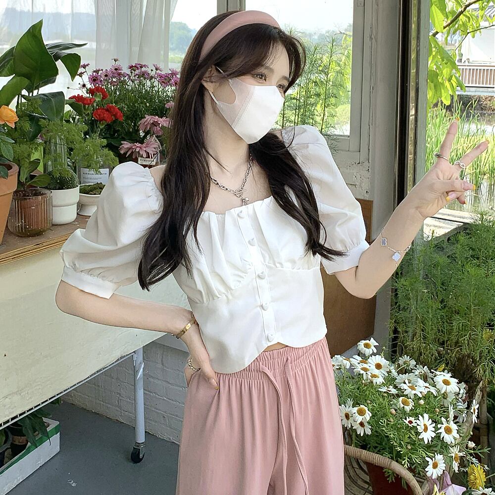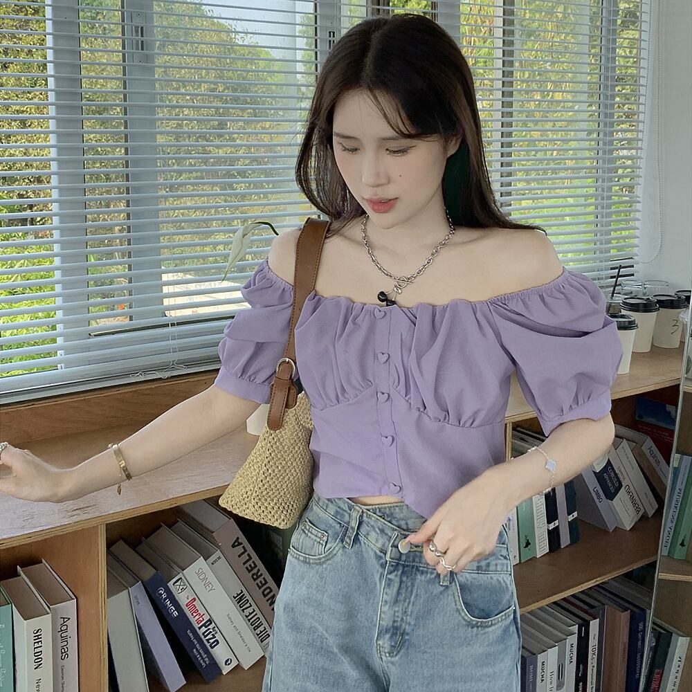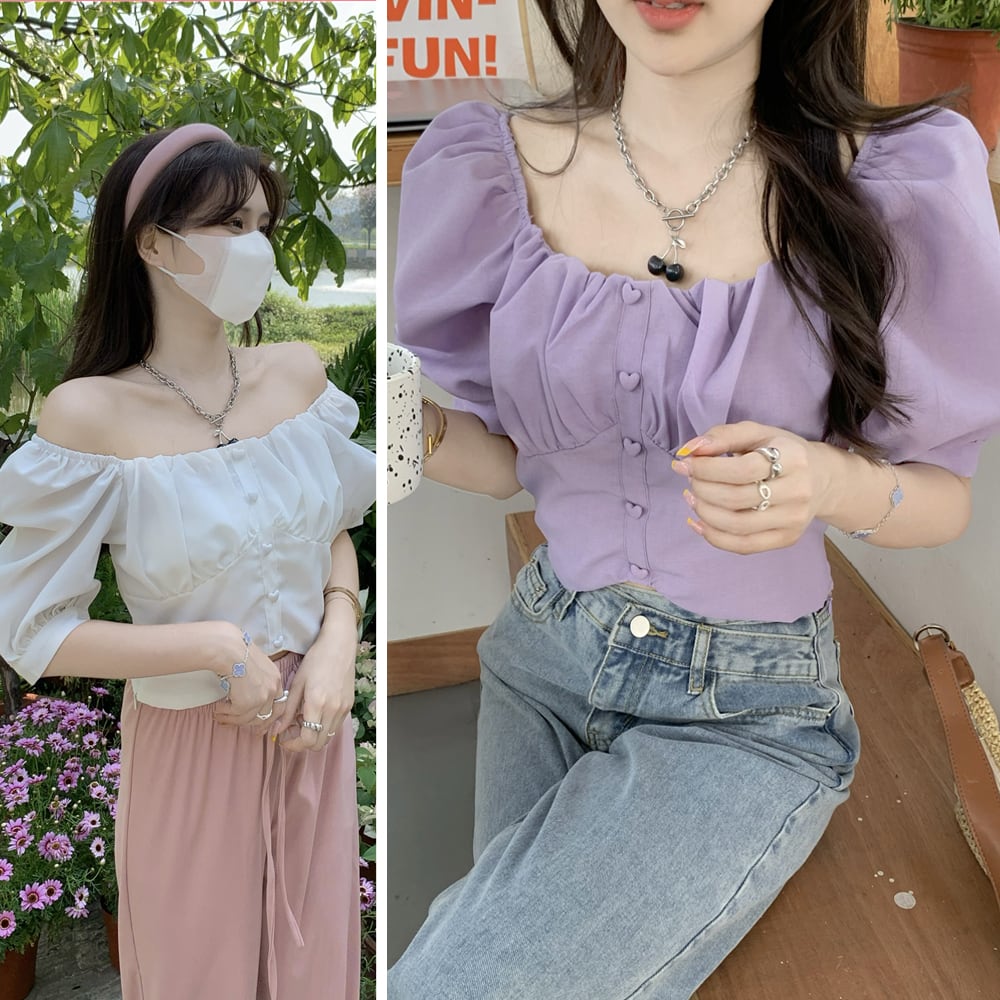 全2色 ハートボタンブラウス バックシャーリング 短丈シルエット クロップド丈 オフショル オフショルダー 胸下切り替え シャーリング切り替え バルーンスリーブ かわいい 大人可愛い きれいめ シンプル カジュアル 大人 おしゃれ お洒落 レトロ 大人可愛い 大人女子 こなれ感 ラフ ラブリー キュート ガーリー 個性的 レディース ビジネス OL 通勤 学生 通学 デート 女子会 お泊まり リゾート 韓国コーデ 韓国ファッション ラベンダー ホワイト