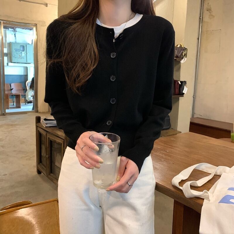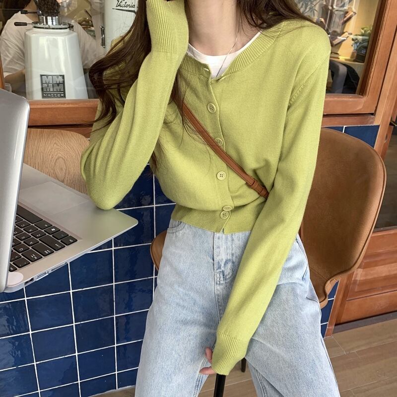 全8色 ニットカーディガン ボタン大きめ ショート丈 シンプル トップス アウター カーディガン ショート 袖あり 長袖 Uネック 襟なし 前開き かわいい 大人可愛い 大人 ラフ ルーズ 抜け感 無地 秋 冬 10代 20代 30代 40代 50代 レディース 女性用 OL 学生 お出かけ 普段使い 楽ちん ワンサイズ 白 ホワイト 黒 ブラック 青 緑 グリーン 茶色 ブラウン 灰色 グレー 黄色 イエロー ピンク オレンジ くすみカラー アプリコット 韓国コーデ 韓国ファッション