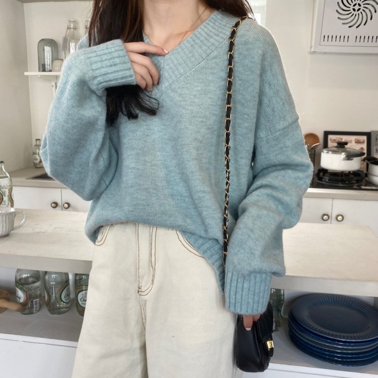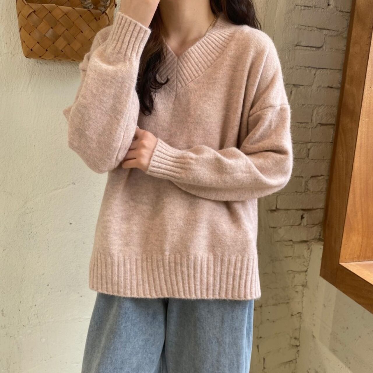 シンプルなデザインのVネック長袖セーター。