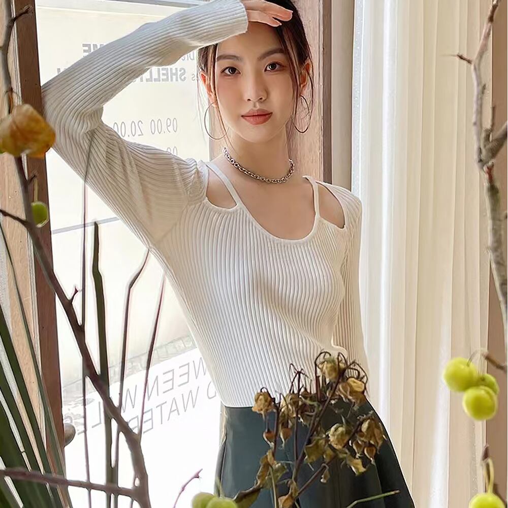全2色 オープンデザイン リブニット カットアウトカットソー スリム タイト 細身 ストレート スマート かわいい 大人可愛い カジュアル 大人 レイヤードフェイクリブニット おしゃれ お洒落 かっこいい レトロ アジアン エスニック エキゾチック 大人可愛い 大人女子 こなれ感 ラフ ラブリー キュート ガーリー 個性的 レディース ビジネス OL 通勤 学生 通学 デート 韓国コーデ 韓国ファッション 黒 白