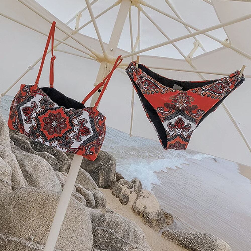 水着 西アジア風エスニック柄バンドゥビキニ チューブトップ ストラップ取り外し可能 ビキニ ホックレス ホックなし ツーピース セパレート スイムウェア キュート パッド付き ワイヤーあり バスト寄せ 盛り ホールド 美バスト レトロ シック モダン セクシー インスタ映え かわいい 大人 おしゃれ スタイリッシュ お洒落 個性的 レディース ホテル 温泉 海 ビーチ プール リゾート 旅行 スタイルアップ オルチャン レッド 韓国コーデ 韓国ファッション