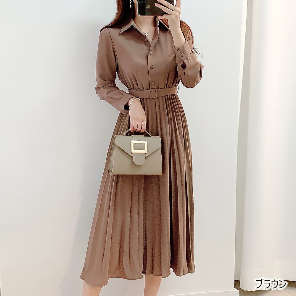 全2色 プリーツワンピース 長袖 ロングワンピース 切り替えデザイン プリーツスカート シャツワンピ ウエストベルト Vネック 襟あり ロングドレス ミモレ丈 ミディアム丈 袖あり 九分袖 ハイウエスト 大人可愛い きれいめ シンプル 大人 上品 おしゃれ 大人女子 きちんと感 清潔感 モード系 エレガント フォーマル 無地 レディース 女性用 ホテル ガーデン レストラン スタイル 春 秋 色展開 韓国コーデ 韓国ファッション 茶色 ブラウン ベージュ