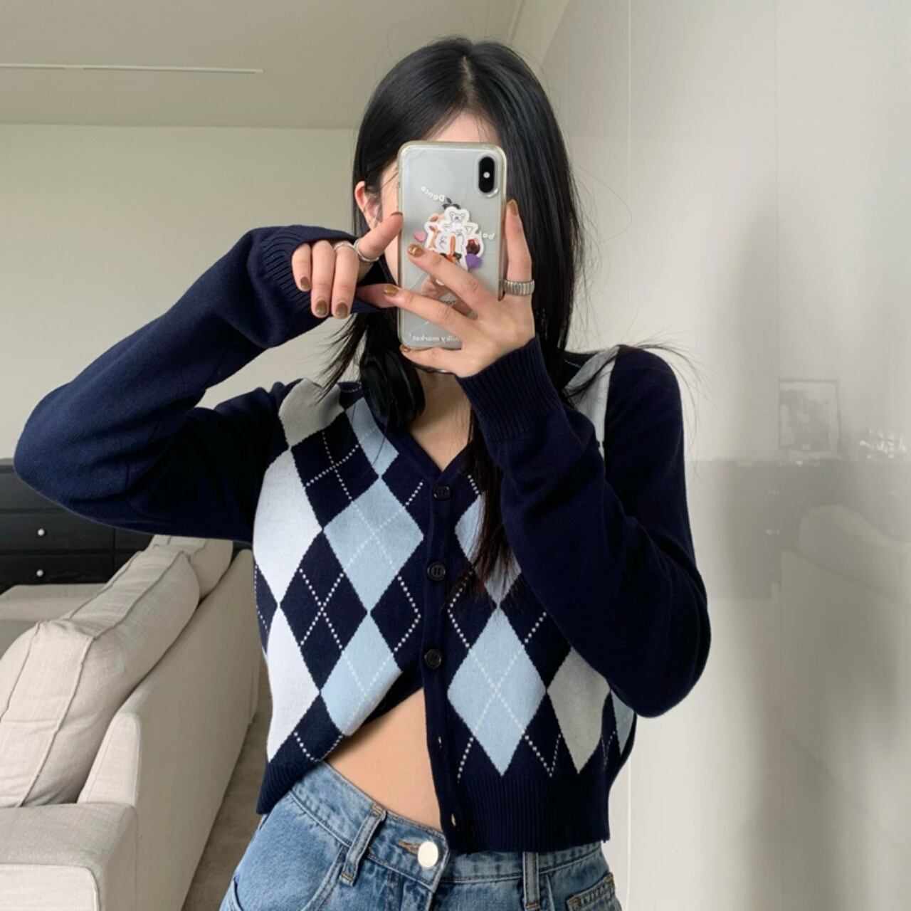 Vネックアーガイル柄カーディガン ミニ丈 クロップド丈 ショート丈 長袖 Vネック 襟なし 前開き ボタン かわいい 大人可愛い シンプル カジュアル 大人 おしゃれ レトロ 大人女子 こなれ感 ラフ キュート 主役級 存在感 秋 冬 10代 20代 30代 レディース 学生 通学 デート お出かけ 公園デビュー 女子会 休日 着回し 普段使い 重ね着 韓国 オルチャン ファッション コーデ スタイル フリーサイズ ネイビー 大人カラー 秋カラー 韓国コーデ 韓国ファッション