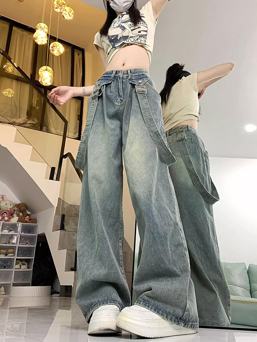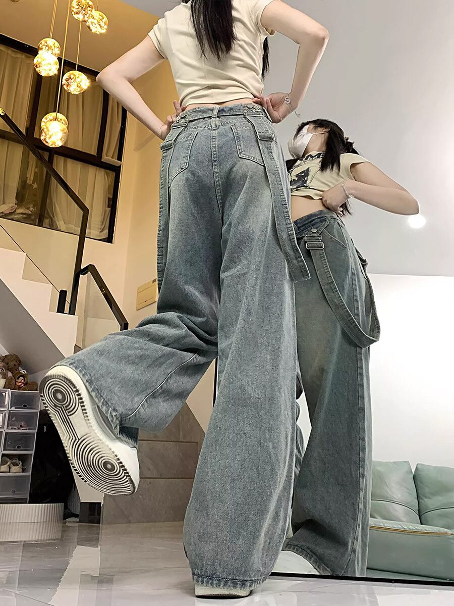 サスペンダー付きワイドデニムパンツ ロング デニム デニムパンツ Gパン ワイドパンツ 肩紐 フリンジライン デニムパンツ ボトムス パンツ Gパン 幅広 サスペンダー ポケット ハイウエスト ブルーデニム シンプル カジュアル おしゃれ かっこいい こなれ感 メンズライク 抜け感 春 夏 秋 冬 シーズンレス レディース オールシーズン 学生 通学 デート 休日 着回し 普段使い 韓国系 オルチャン 脚長 定番 青 ブルー 韓国コーデ 韓国ファッション