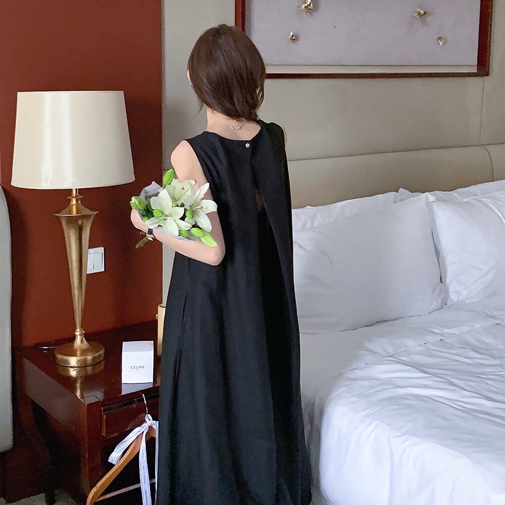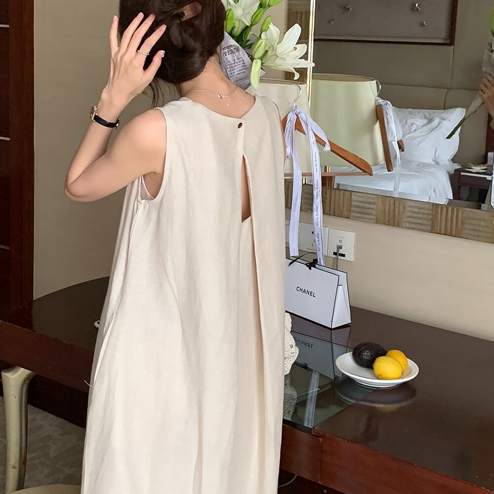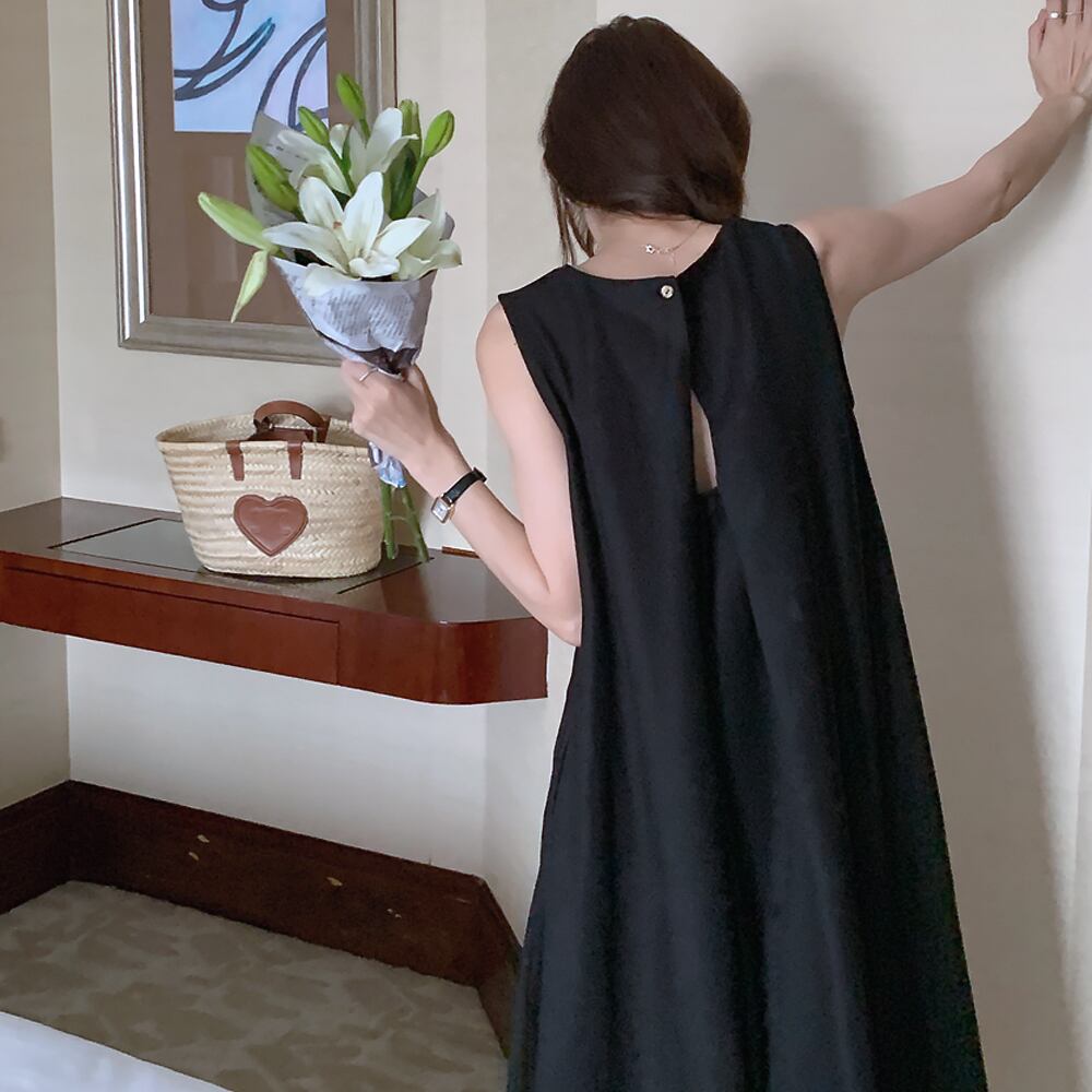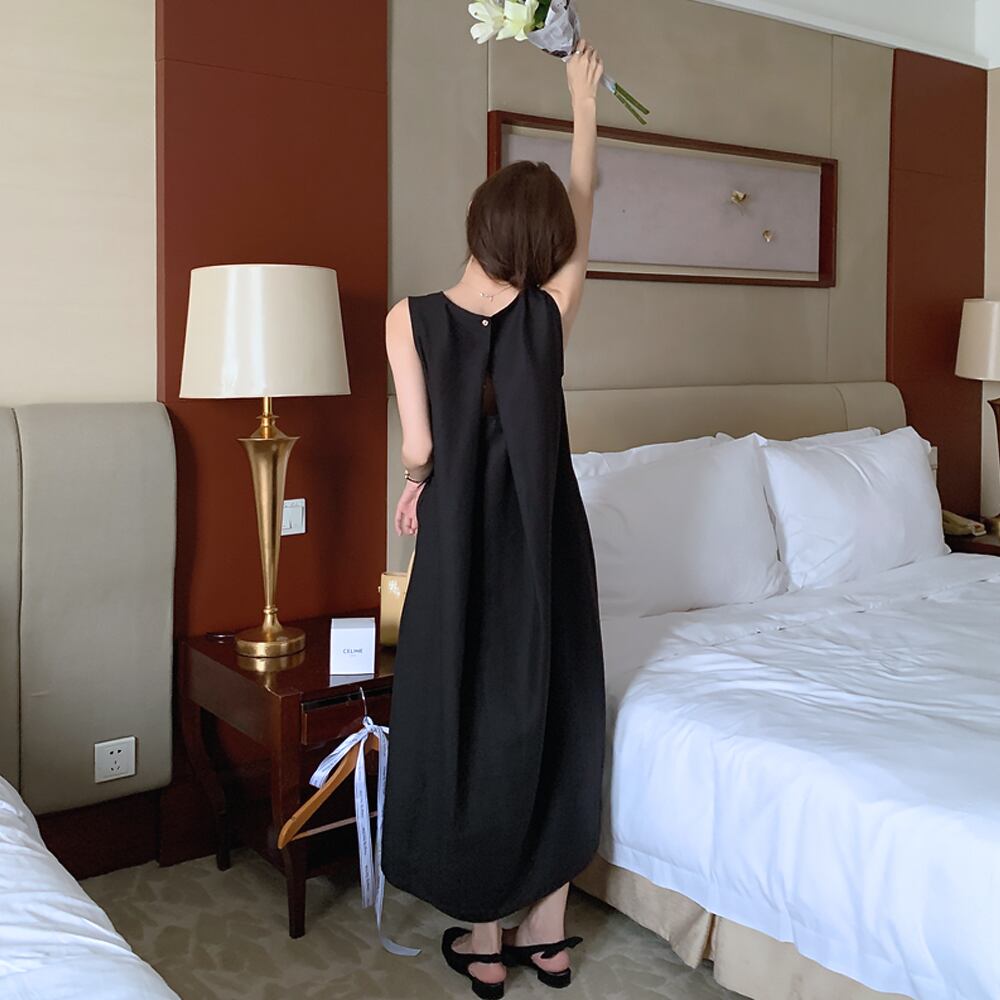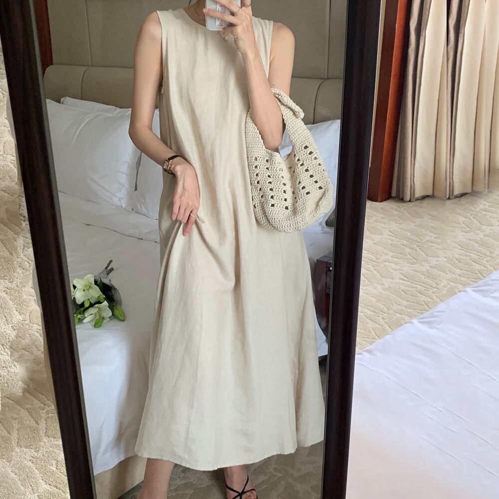 全2色 ノースリーブワンピース ワンピドレス 背中ちら見せ ロング 袖なし ノースリーブ リゾートワンピース リゾートドレス サマードレス クルーネック 襟なし フレア ワイド Aライン バックボタン 背中タック 綿 麻 大人可愛い きれいめ シンプル カジュアル 上品 おしゃれ お洒落 かっこいい レトロ アジアン ナチュナル 大人女子 こなれ感 ラフ ラブリー キュート ルーズ 個性的 モード系 無地 レディース 休日 着回し 普段使い 韓国コーデ 韓国ファッション ベージュ ブラック