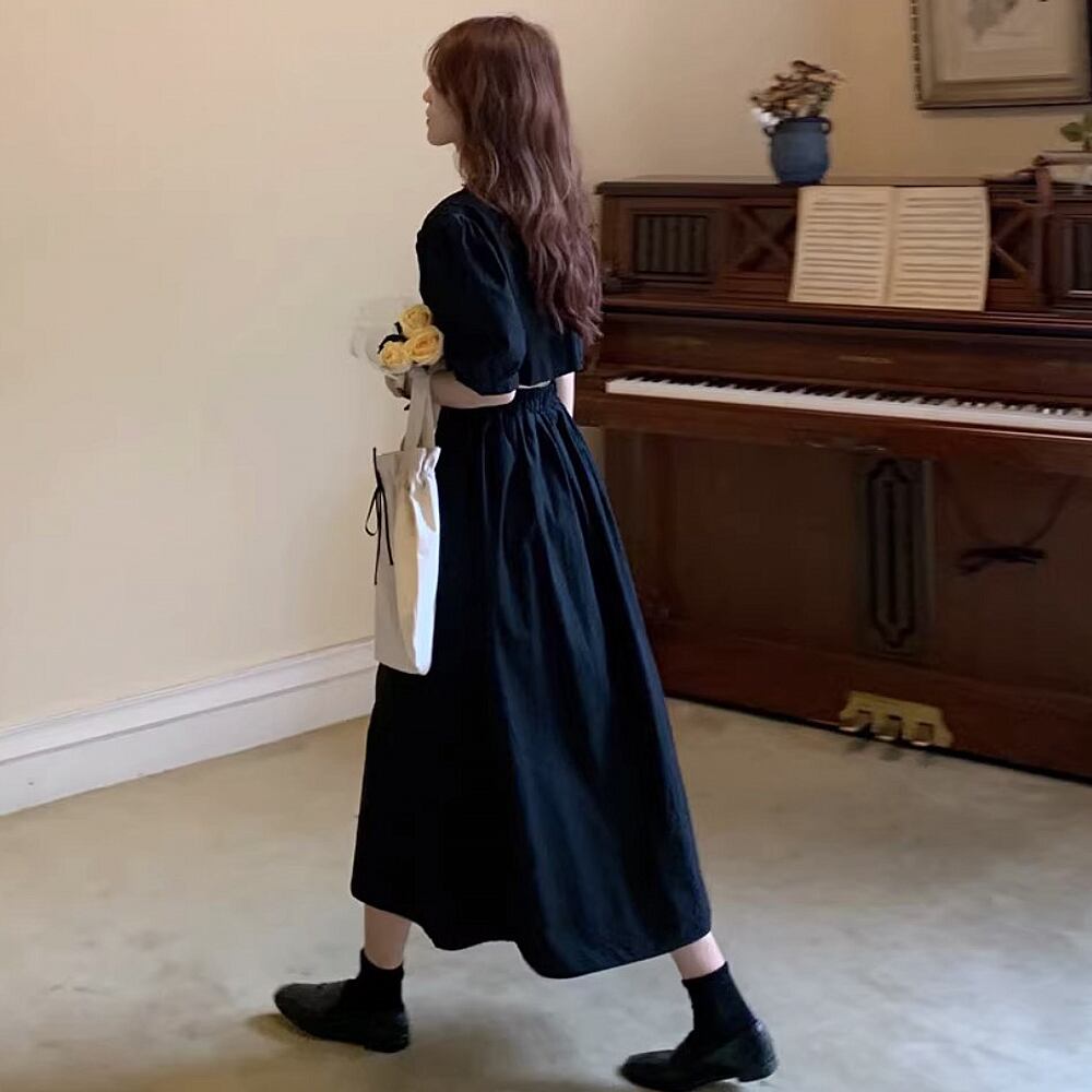 全3色 背中ちら見せ ワンピース サマーワンピース シャツワンピース フレアワンピース ワンピドレス 膝下 ミモレ ミモレ丈 ミディアム丈 半袖 パフスリーブ ラウンドネック クルーネック フレア バックスクエアネック スリム ストレート ワイド Aライン 切り替えデザイン スマート ウエスト後ろゴム ウエストゴム かわいい 大人可愛い きれいめ おしゃれ お洒落 大人女子 こなれ感 個性的 モード系 主役級 存在感 抜け感 無地 韓国コーデ 韓国ファッション 白 黒