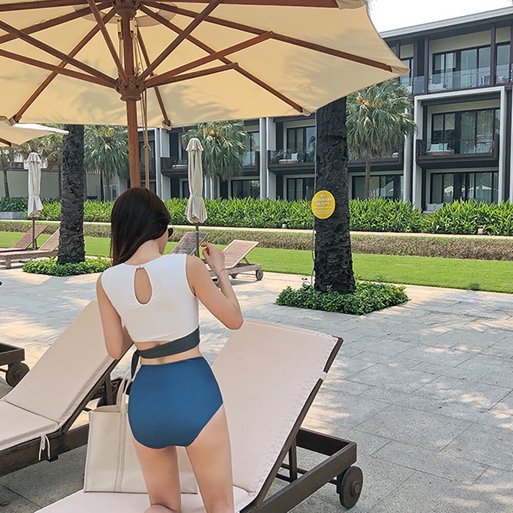 水着 ノースリーブウエストクロスビキニ タンキニ ビキニ ツーピース セパレート 露出控えめ 露出少なめ ホワイト 白 ネイビー 紺 青 ハイウエスト ウエストリボン 切り替えデザイン パッド付き ワイヤーなし スタイリッシュ 上下色違い 大人 大人っぽい おしゃれ モード系 モダン ラブリー キュート ガーリー レディース 海 ビーチ プール リゾート バカンス 美脚 脚長 スタイル 高見え 格上げ モテ 韓国コーデ 韓国ファッション