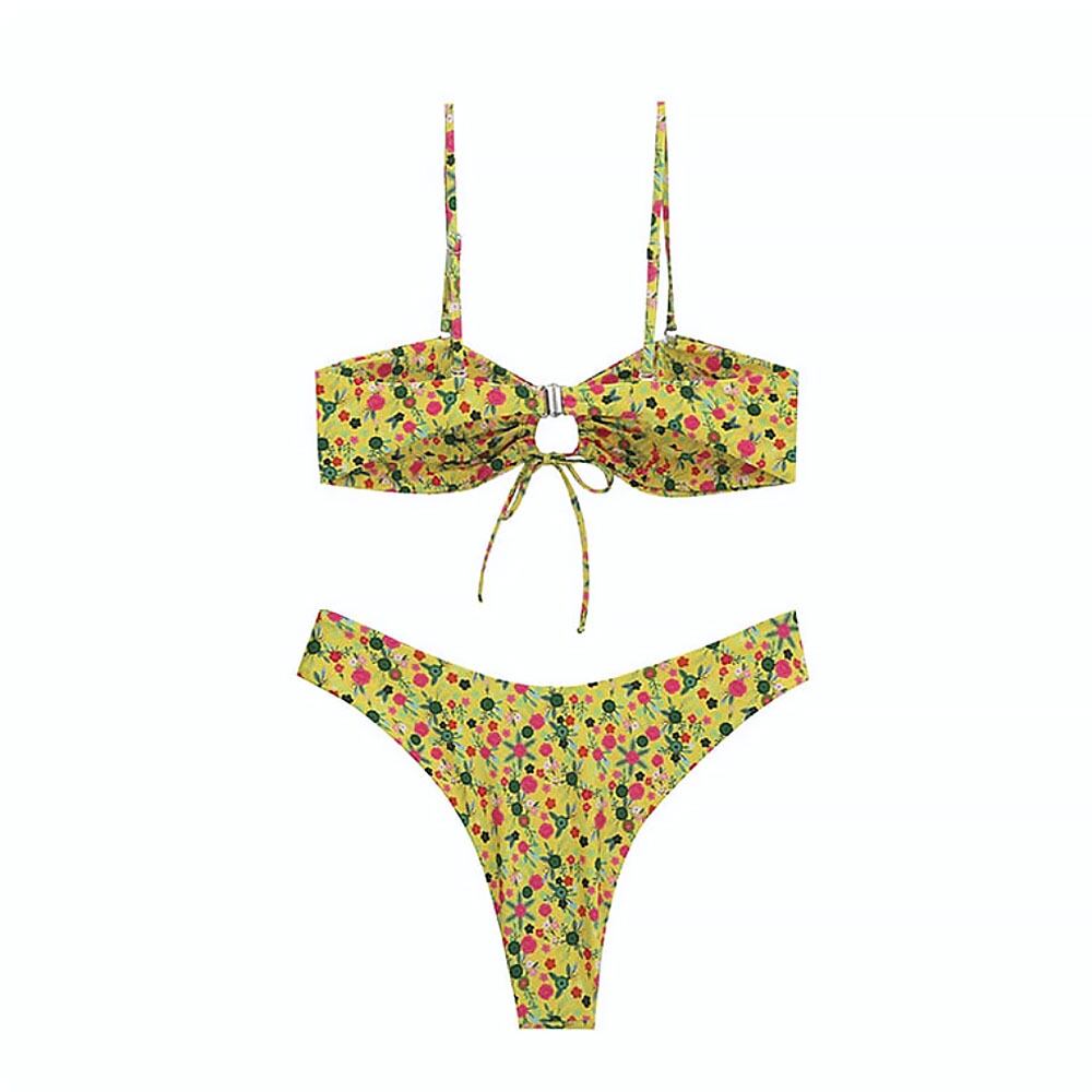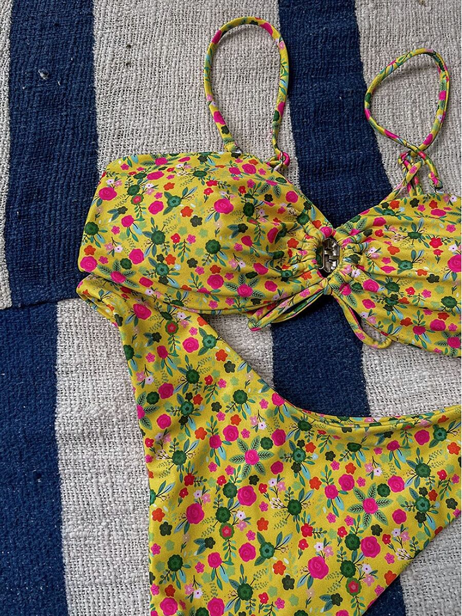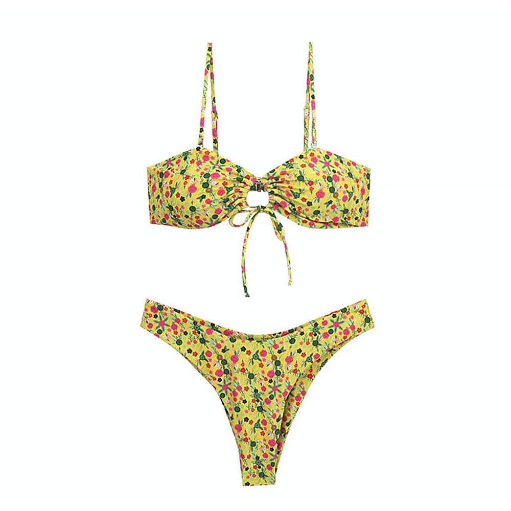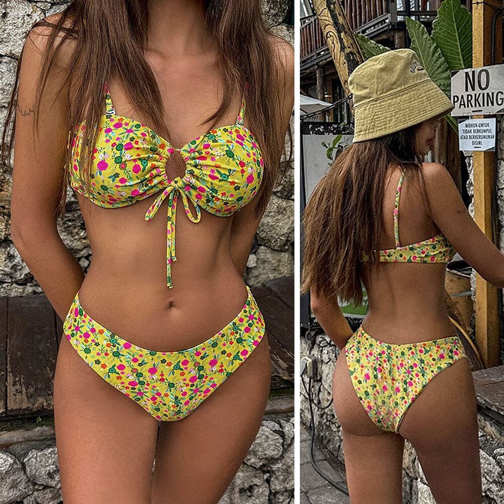 水着 イエローキーホールビキニ ビキニ 花柄 小花柄 フラワープリント フロントリボン 露出度多め 露出度高め ブラジリアンビキニ 胸元シャーリング フワラープリント タイニービキニ ツーピース 胸パッド付き ワイヤーなし 胸元カバー かわいい 大人可愛い きれいめ セクシー 大人 大人っぽい おしゃれ ラブリー キュート ガーリー 個性的 スタイリッシュ 夏 海 ビーチ プール リゾート 韓国コーデ 韓国ファッション