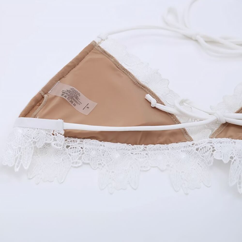 水着 レースビキニ ビキニ ホワイト レース 白 マイクロビキニ クロシェレース 紐ビキニ 三角ビキニ リボン バックリボン スイムウェア パッド付き ワイヤーなし レトロ モダン フェミニン セクシー 谷間寄せ 大人 おしゃれ お洒落 女っぽ 個性的 レディース ホテル 温泉 海 ビーチ プール リゾート 旅行 着痩せ スタイルアップ 美スタイル 韓国 韓国系 韓国コーデ 韓国ファッション