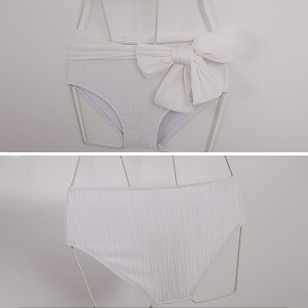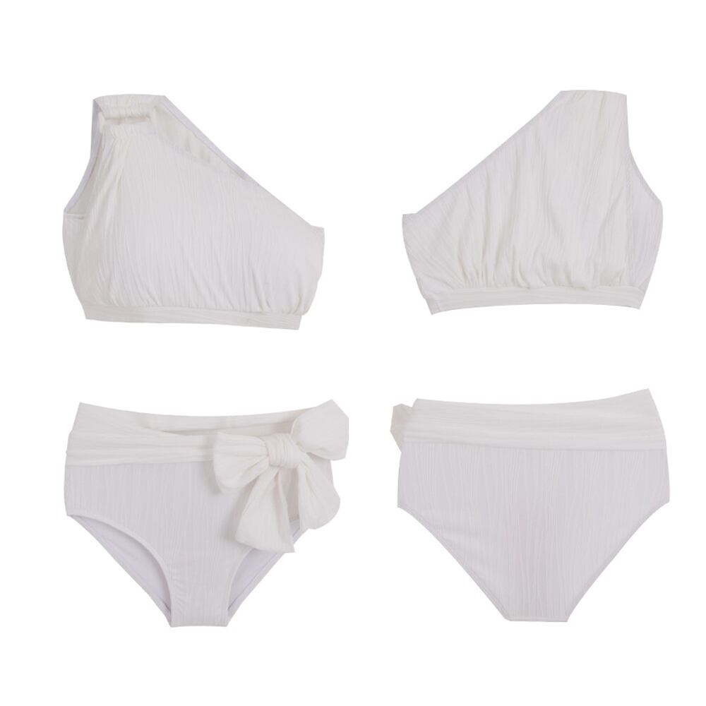 くしゅっとした生地が立体的な白のワンショルダービキニにウエストマーク用のリボンが付属します。