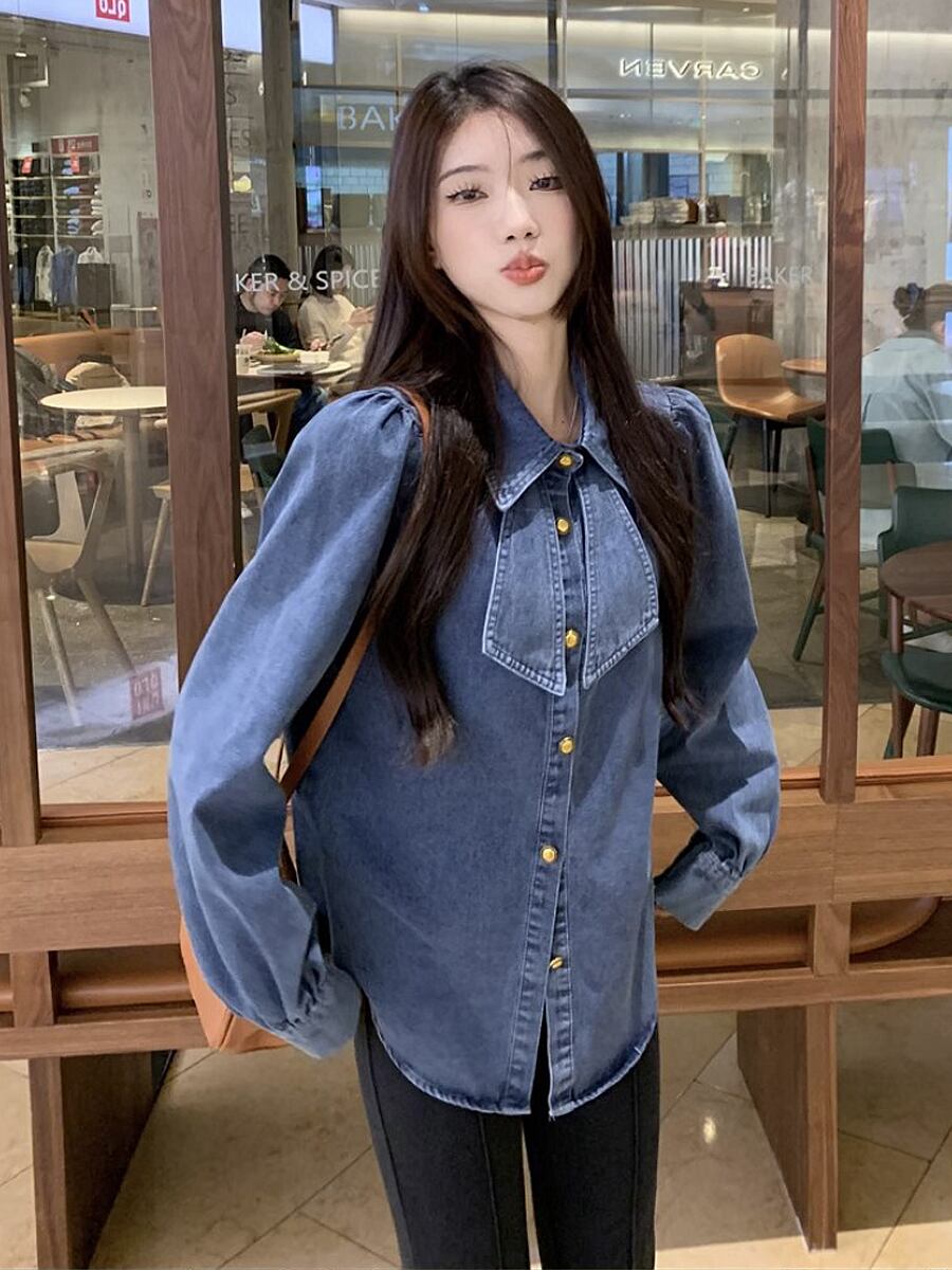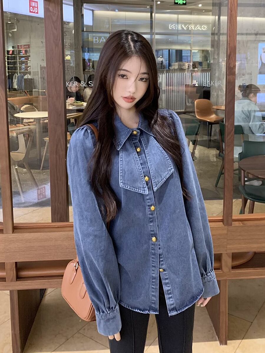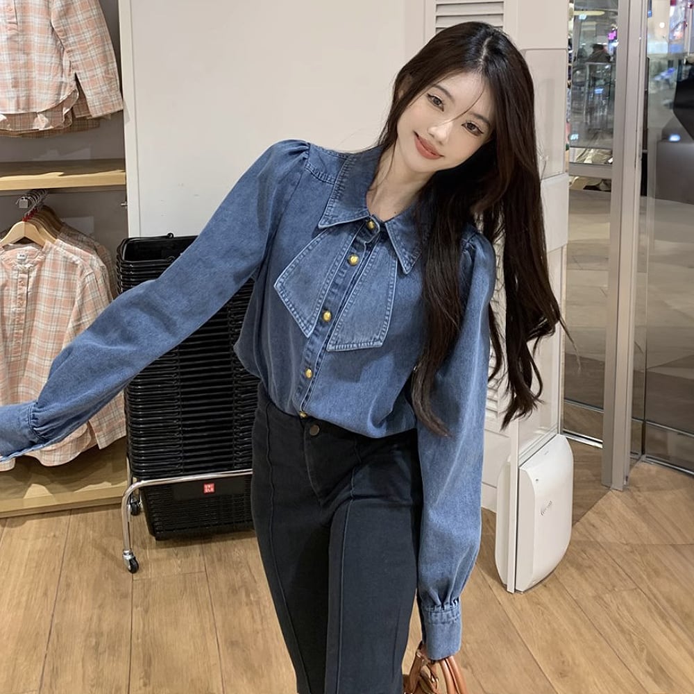 ボウタイ風デニムボウタイシャツ シャツブラウス デニムシャツ ボウタイ リボン 変形カラー 変形襟 飾りボタン 長袖 ソフトデニム パフスリーブ デニムブルー かわいい 大人可愛い きれいめ シンプル きれいめ 上品 おしゃれ かっこいい レトロ こなれ感 ラブリー キュート 個性的 モード系 エレガント モダン 主役級 存在感 抜け感 レディース お出かけ 女子会 韓国コーデ 韓国ファション 青 ブルー