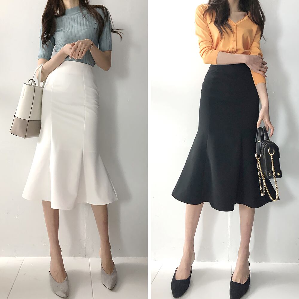 全2色 マーメイドスカート スカート 無地 フィッシュテール スリム シンプル タイトスカート 膝下 ミモレ ミモレ丈 セミフレア ベーシックコーデ マーメイド はい薄エスト タイト オフィスコーデ 大人可愛い きれいめ シンプル カジュアル 上品 おしゃれ 大人女子 こなれ感 ラフ ラブリー キュート ガーリー ルーズ エレガント 韓国コーデ 韓国ファッション 白 黒 S M L XL LL