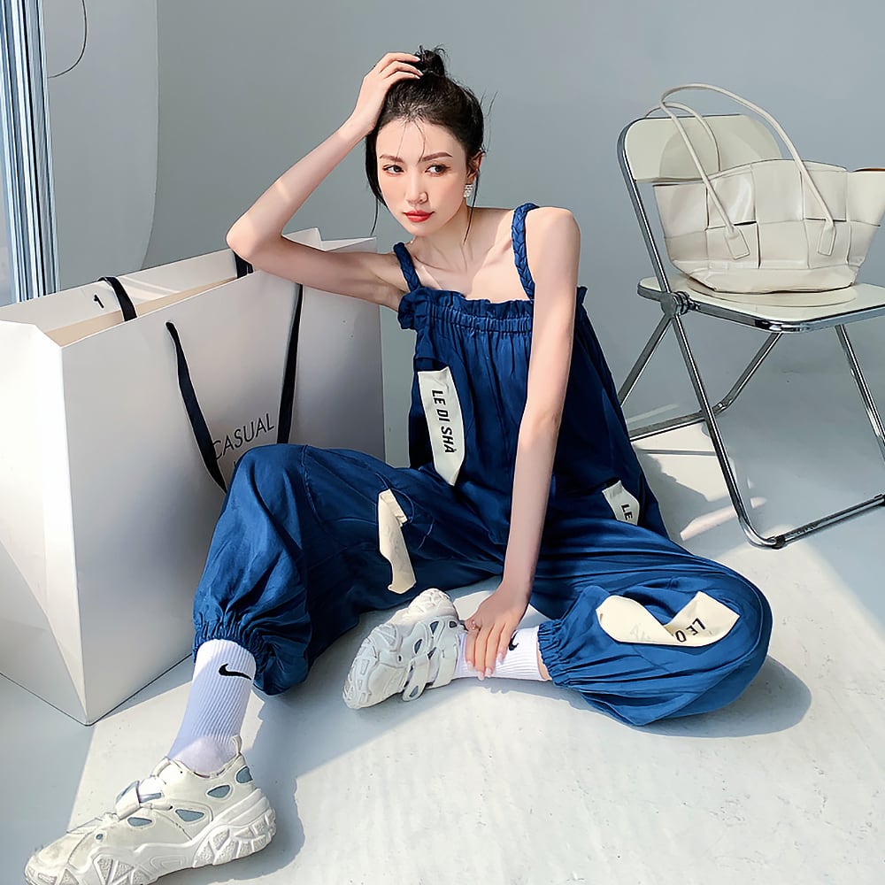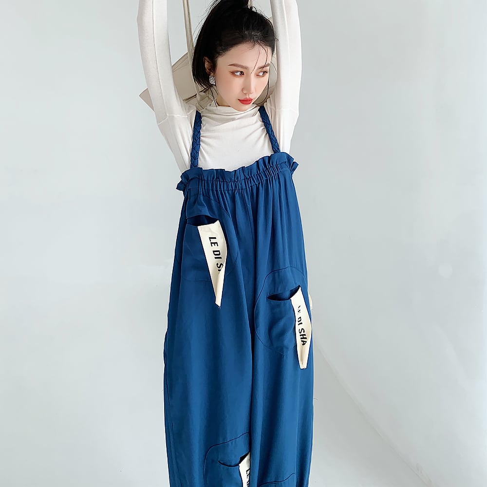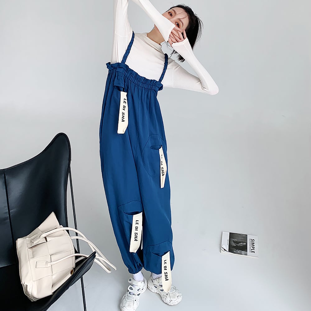 オーバーオール サロペットパンツ サロペット 楽ちん ゆったり かわいい ワイド リラックスコーデ ワイドパンツ ルーズ 重ね着 お家時間 ポケットあり 個性的 ゆるワイド 綿素材 足首絞り 春 夏 秋 コットン レディース お気楽 青 濃紺 ブルー ネイビー タグ模様 普段着 お出かけ レジャー 九分丈 9分丈 ママコーデ マ 20代 30代 40代 50代 韓国コーデ 韓国ファッション