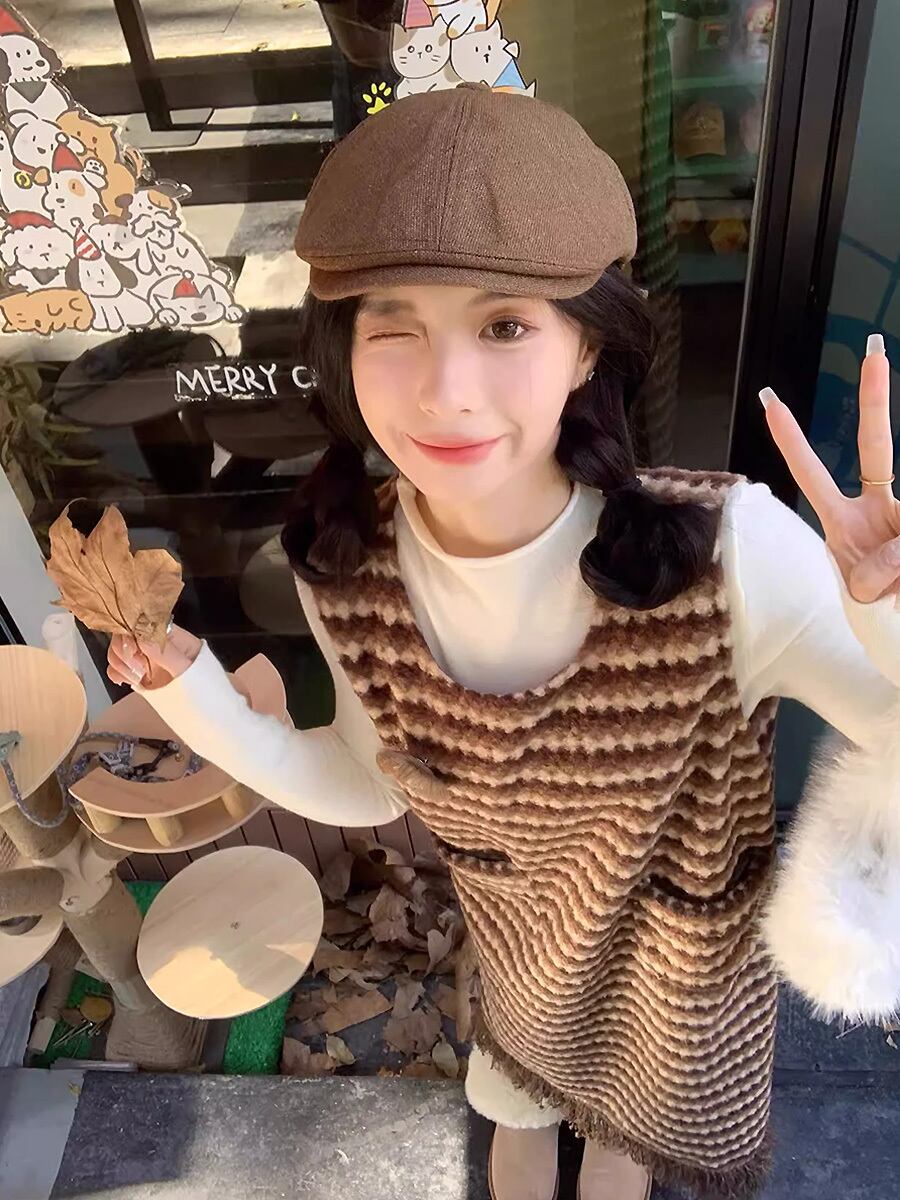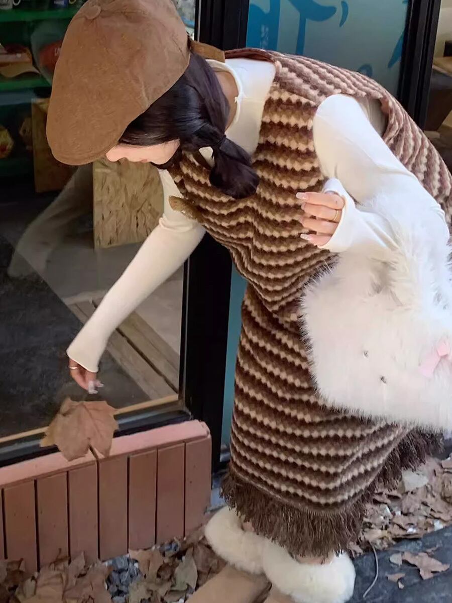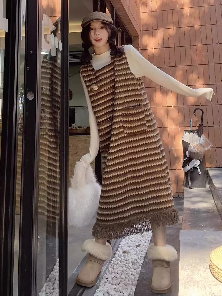 ニットボーダーラウンドネックニットジャンパースカート ジャンスカ ジレ ロングジレ オーバーサイズ ニットジャンパースカート ニットジャンスカ フリンジ ポケット 裾フリンジ ボーダー 縞々 シマシマ 編み込み あったか 大きめ トップス ニットソー ラフ ルーズ ルーズ ゆったり 温かい シンプル 大人女子 体型カバー リゾート 旅行 おしゃれ デート オルチャン 韓国 お出かけ 旅行 普段着 通勤 通学 韓国コーデ 韓国ファッション ブラウン