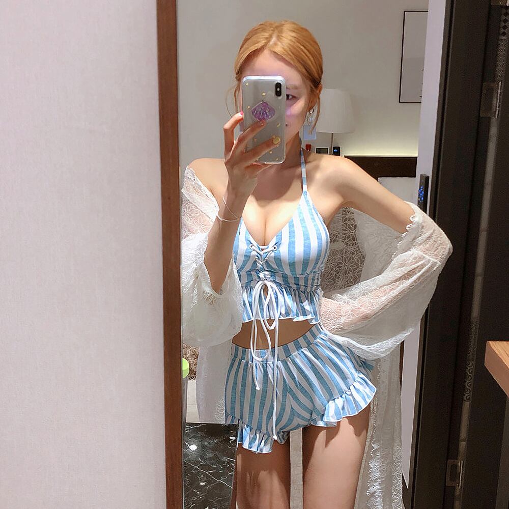 3点セット 編上げ ブルーストライプ 水着 上下ビキニ+カバーパンツ ブルー 青 胸元リボン 背中カットオフ ビキニ ハイウエスト お腹楽ちん 体型カバー シマシマ ショットパンツ ハイウエスト エレガント きれいめ フェミニン かわいい パッド付き ワイヤーなし 伸縮性 胸元 谷間 谷間魅せ 盛れる セット 上下セット かわいい 大人可愛い きれいめ セクシー sexy 華やか おしゃれ スタイリッシュ 美脚 脚長 韓国コーデ 韓国ファション スイムウェア