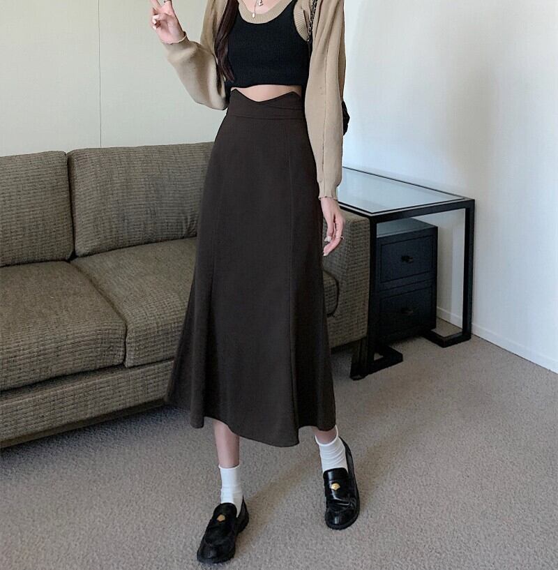 ウエストV字カット 美シルエット スタイルアップ スカート ボトムス 膝下 ミモレ丈 ミディアム丈 ソフトマーメイド Aライン スマート ハイウエスト バックファスナー きれいめ シンプル カジュアル 大人っぽい 上品 おしゃれ お洒落 エレガント シック 無地 秋 冬 レディース 女性用 ママ 女の子 オフィス OL 通勤 学生 通学 デート お出かけ 女子会 休日 着回し 普段使い 合わせやすい 韓国系 オルチャン ファッション コーデ スタイル 脚長 S M L XL 黒 ブラック 茶色 ブラウン