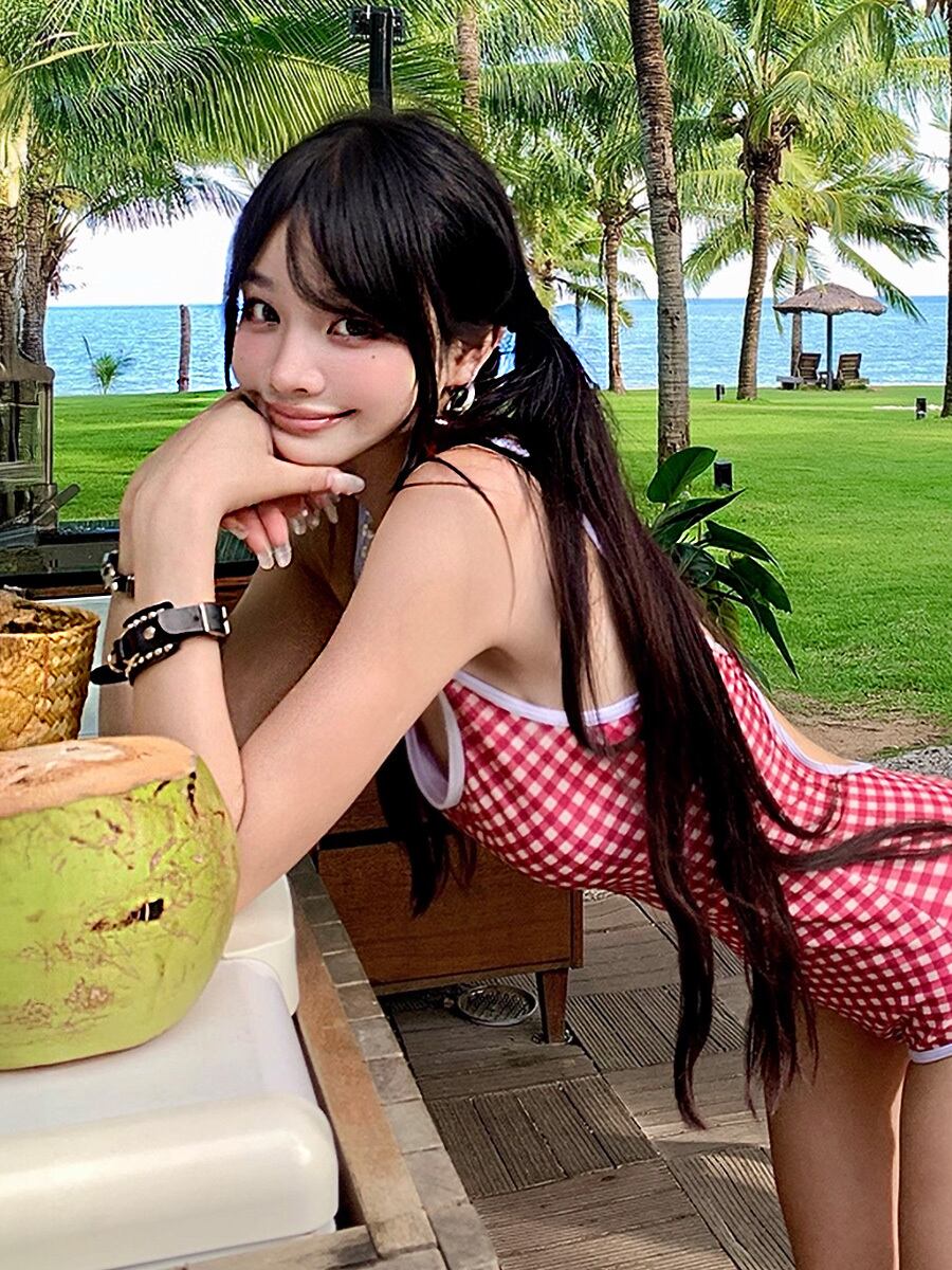 レッドのチェックにホワイトのパイピングのコントラストがガーリーで可愛い水着です。