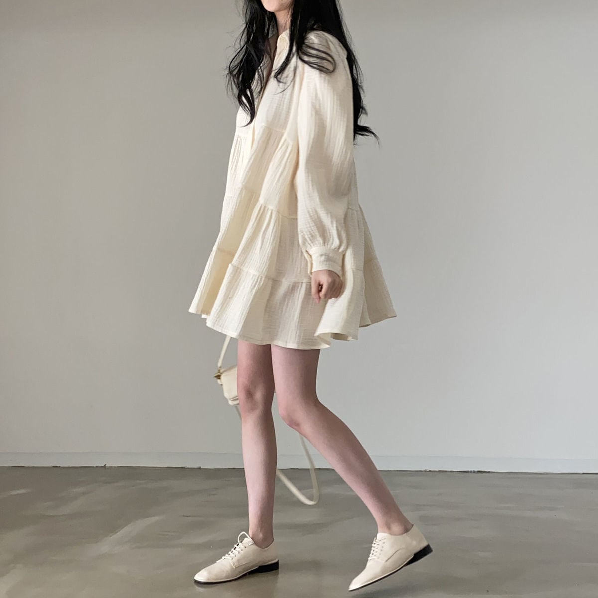 全2色 ティアード ワンピース オーバーサイズ フロントボタン 足見せ マイクロミニ シャツワンピース ショート丈 ミニ丈 膝上 長袖 パフスリーブ ボリューム袖 段々フリル Aライン 切り替えデザイン 前開き かわいい 大人可愛い シンプル カジュアル おしゃれ 春 秋 レディース 学生 通学 デート お出かけ 休日 普段使い 重ね着 着回し 韓国系 オルチャン 体系カバー 美脚見せ フリーサイズ 大きめ ゆったり ゆる サイズ ブラック ベージュ 韓国コーデ 韓国ファッション