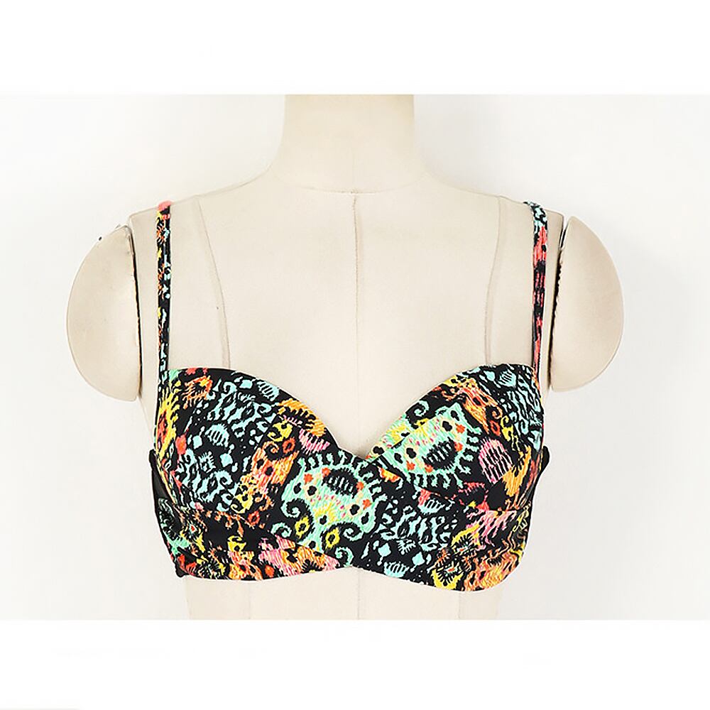 カラフルなエスニック柄プリントのビキニとラグラン袖のラッシュガードのセットです。