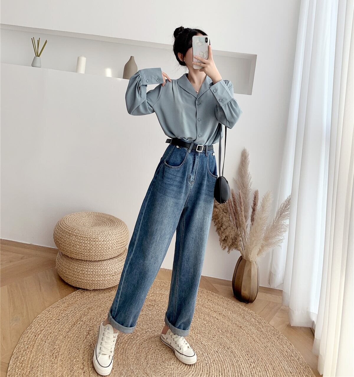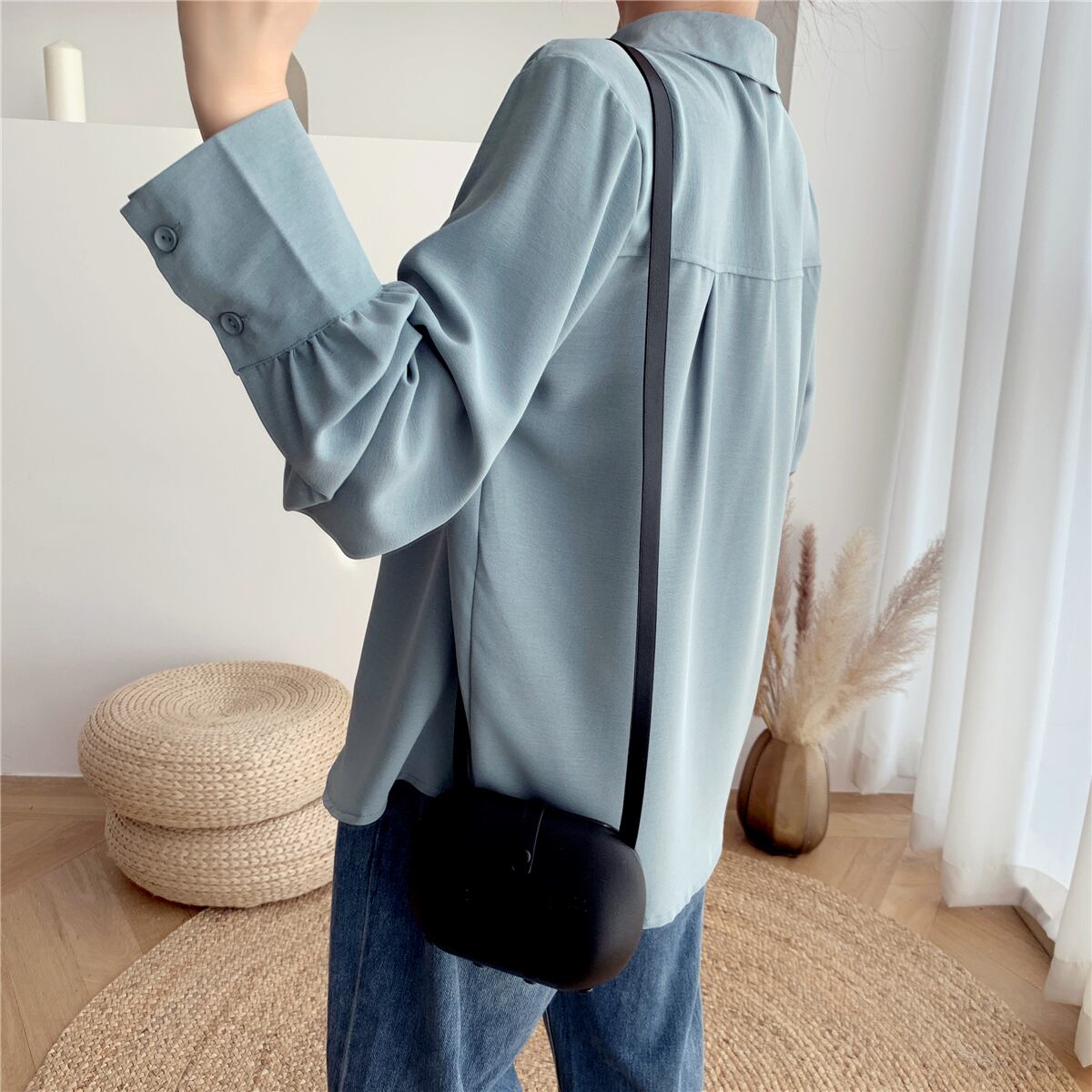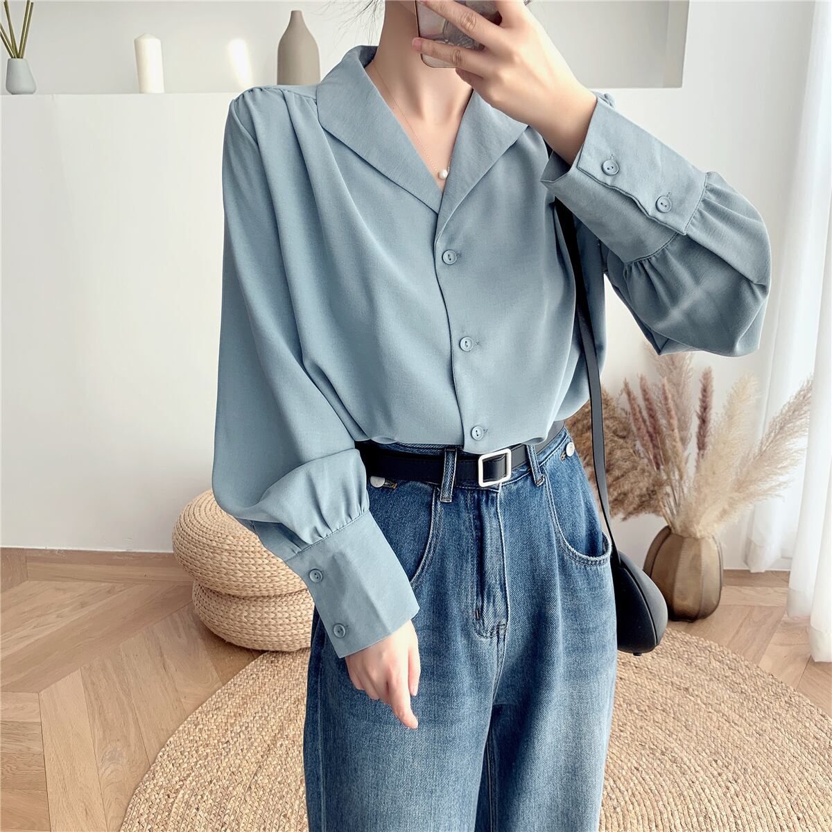 全2色 ぽわん袖 シャツブラウス ロングカフス オーバーサイズ トップス ブラウス ミディアム丈 長袖 ランタンスリーブ ボリューム袖 襟付き トライアングルカラー かわいい 大人可愛い シンプル カジュアル きれいめ 上品 おしゃれ お洒落 こなれ感 無地 春 秋 冬 レディース 女性用 ママ 女の子 OL 通勤 学生 通学 デート 着回し 重ね着 普段使い 韓国系 オルチャン 体系カバー S M L XL 大きめ ゆったり サイズ 白 ホワイト 青 ブルー 韓国コーデ 韓国ファッション