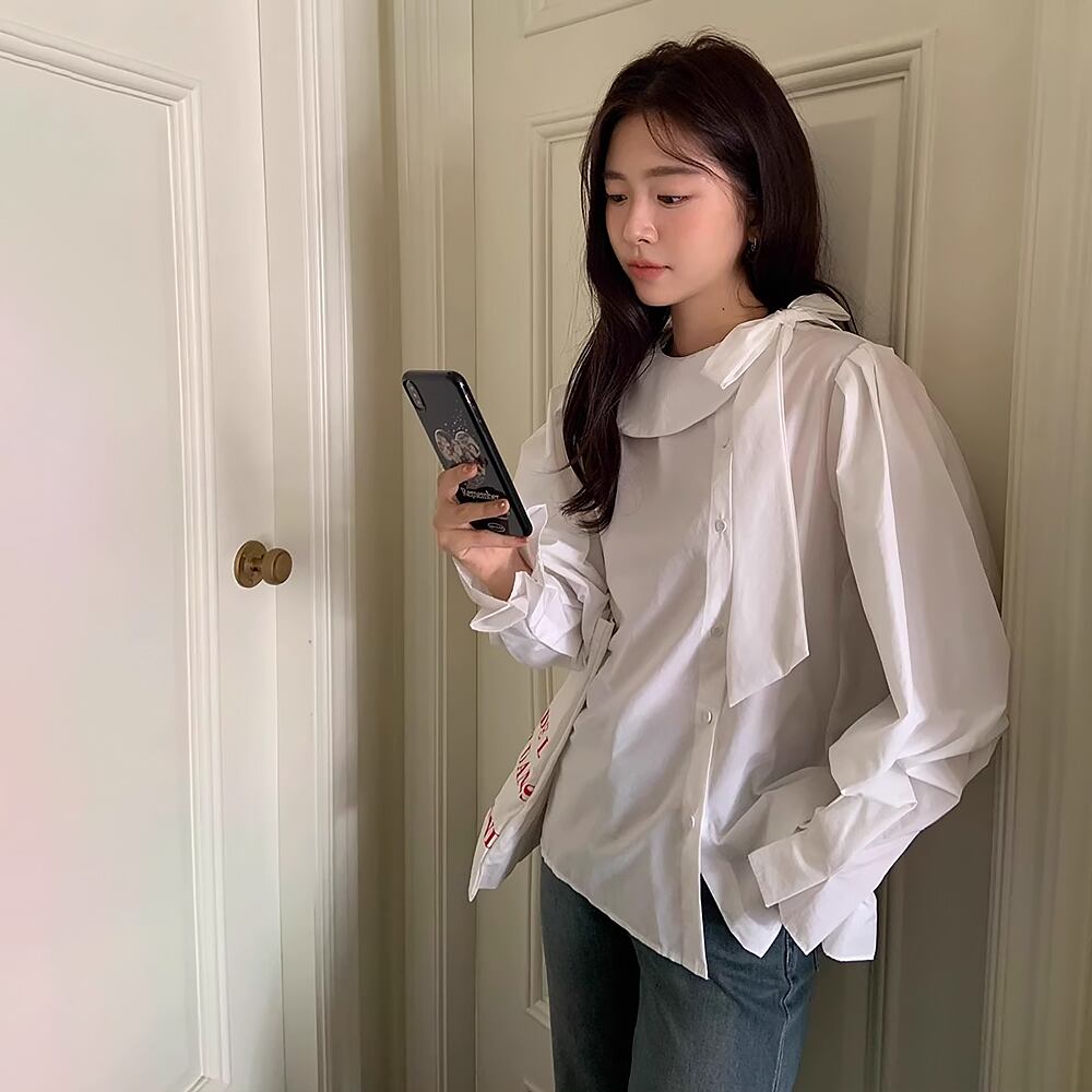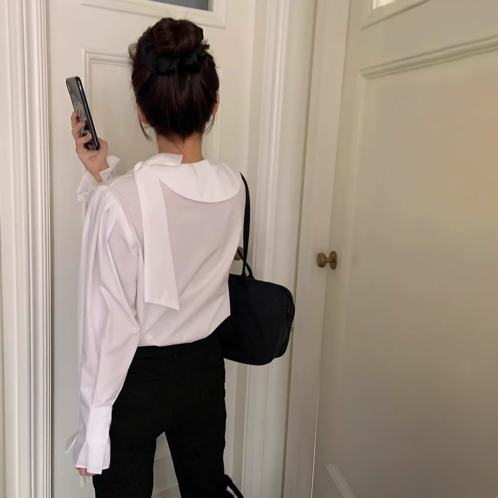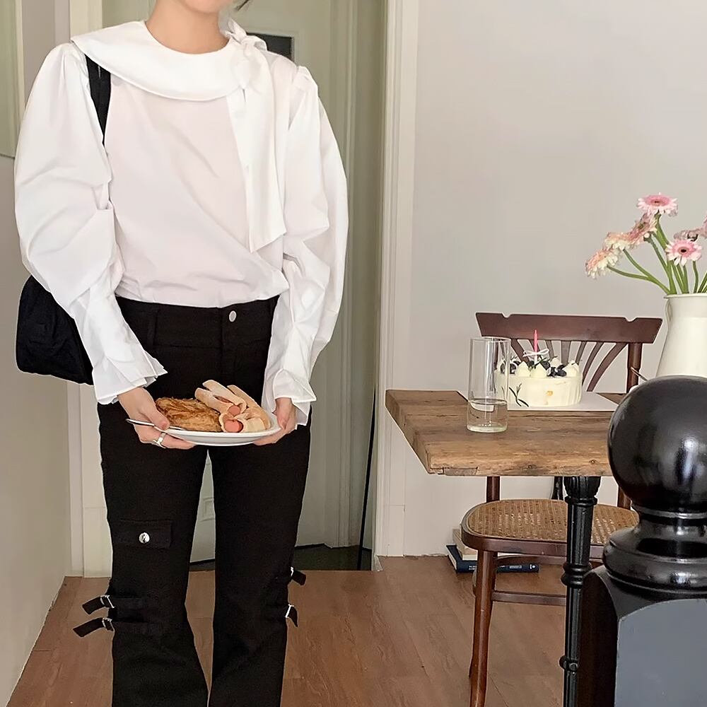 アシンメトリーサイドボウタイシャツブラウス 長袖 ホワイト白 丸襟 サイドボタン ボウタイ リボン ロマンチック シャツ ブラウス ミディアム丈 長袖 ボリューム袖 パフスリーブ フレアスリーブ ホルンスリーブ ワイド 前開き 白ブラウス かわいい 大人可愛い きれいめ おしゃれ 大人女子 こなれ感 ラフ キュート ガーリー 個性的 エレガント 主役級 存在感 抜け感 韓国コーデ 韓国ファッション