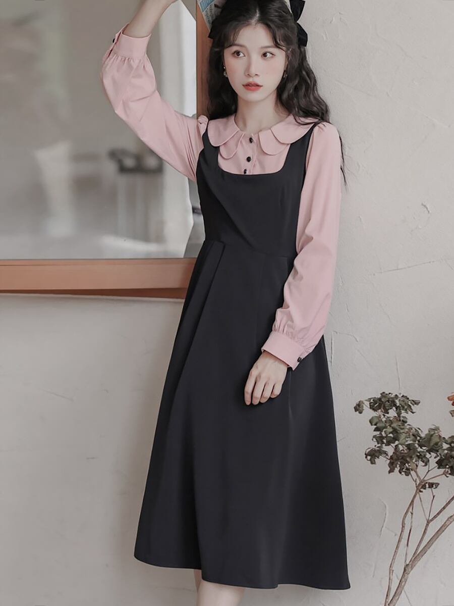 重ね衿ドッキングワンピース ジャンパスカート ピンクブラウス風 異素材ワンピ ドッキングワンピ Aライン ダブルカラー 重ね衿 切り替えデザイン バックリボン 背中リボン 長袖 薄いピンク 黒 ブラック かわいい 大人可愛い コーデ風ワンピース 切り替えワンピース カジュアル 大人 上品 おしゃれ お洒落 レトロ 大人可愛い 大人女子 こなれ感 ラフ ラブリー キュート ガーリーレディース ビジネス OL 通勤 学生 通学 デート お出かけ 韓国コーデ 韓国ファッション