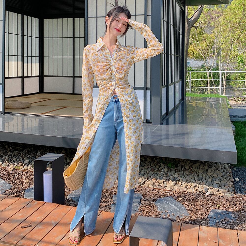 春らしいイエローの小花柄のロングシャツブラウスです。