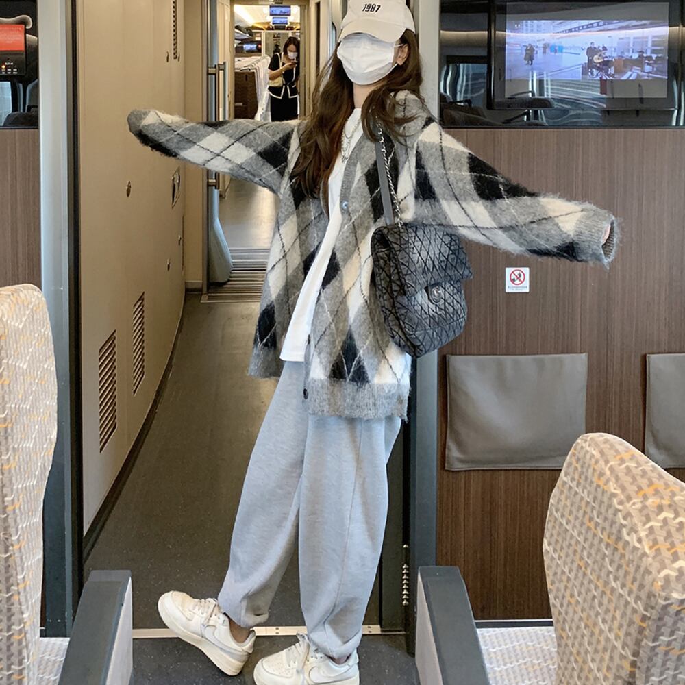 トップス アーガイル柄カーディガン 毛糸 モノトーン 白黒 カットソー ニットソー セーター カーディガン 上着 ミディアム丈 袖あり 長袖 ソフトタッチ Vネック 襟なし ワイド もこもこ モコモコ ふわふわ ポケット 前開き 編み込み ニット 厚手 かわいい 大人可愛い シンプル おしゃれ お洒落 大人女子 こなれ感 ラフ ラブリー キュート ガーリー 個性的 存在感 お出かけ 休日 着回し 普段使い オルチャン 韓国コーデ 韓国ファッション