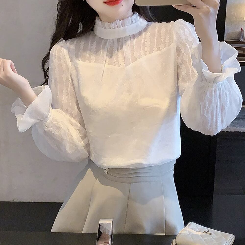 ハイネックハーフシースルーブラウス トップス ブラウス 長袖 ボリューム袖 ハイネック 襟付き フレア レース フリル 透け感 刺繍 チュール シースルー ガーリー シフォン 大人可愛い きれいめ シンプル カジュアル 大人 おしゃれ お洒落 大人女子 ラブリー キュート 無地 柄 春 秋 10代 20代 レディース オフィス ビジネス OL 通勤 学生 通学 デート お出かけ 韓国 韓国系 オルチャン ファッション コーデ スタイル モテ サイズ 韓国コーデ 韓国ファッション