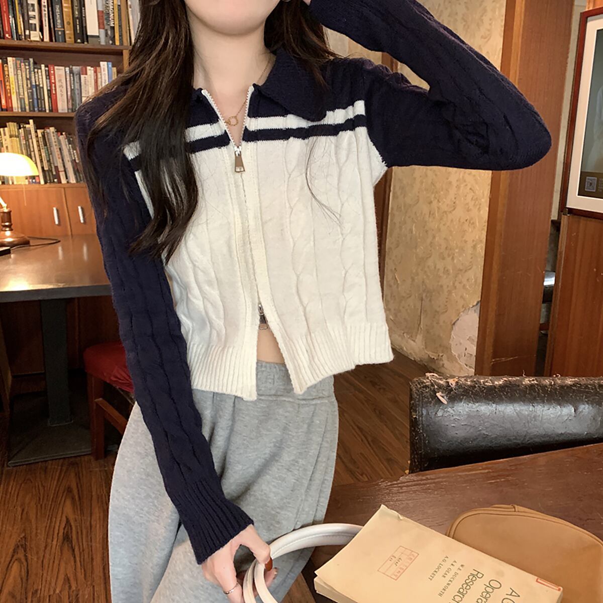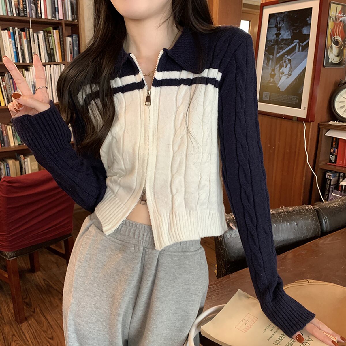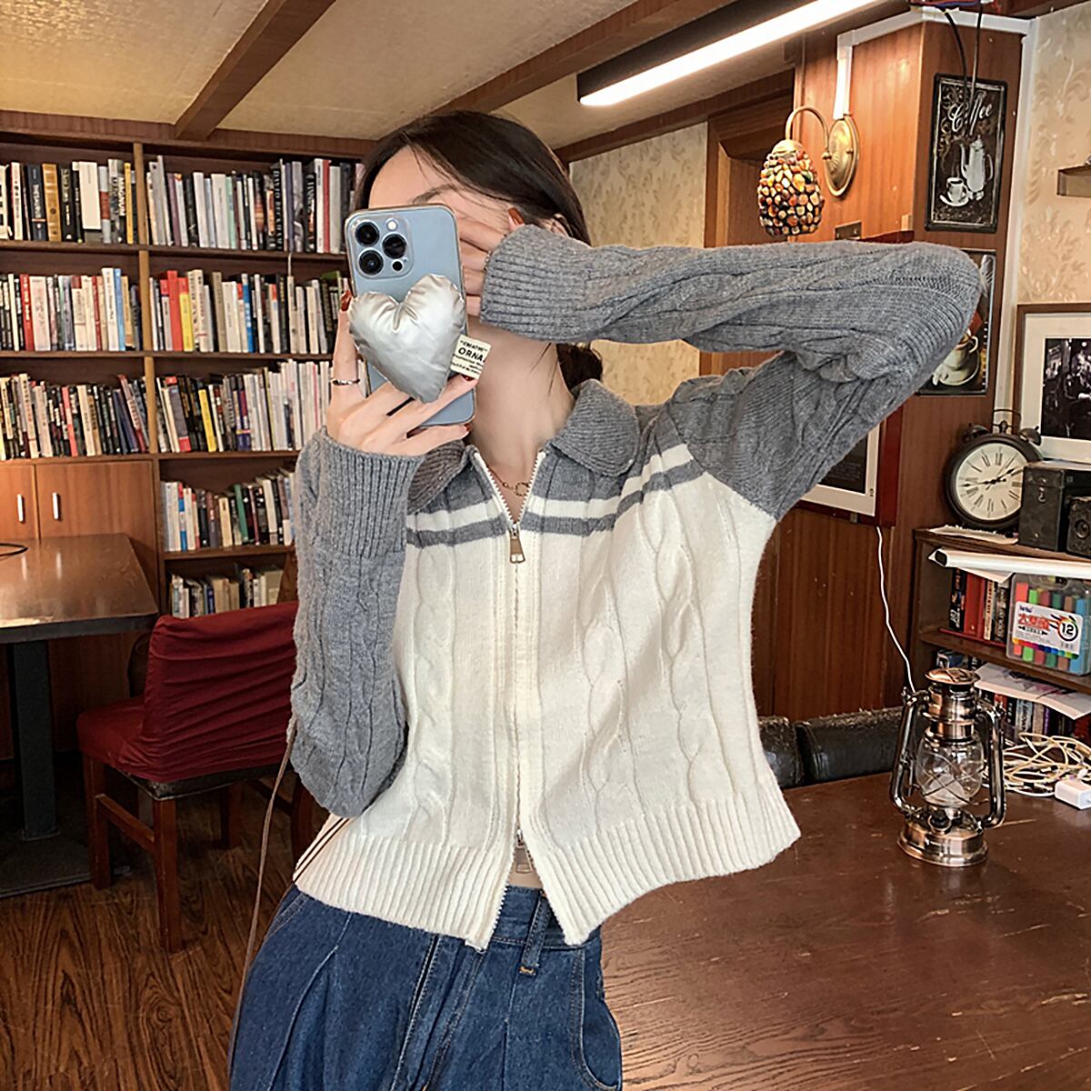 全2色 ジップアップカーディガン カラーブロック 色切替え お腹見せ おへそ見せ ダブルジップ 羽織りもの クロップド トップス セーター カーディガン ショート丈 長袖 襟付き ケーブルニット 切り替えデザイン ダブルファスナー 前開き かわいい シンプル カジュアル おしゃれ お洒落 こなれ感 縄模様 秋 冬 春 レディース 女性用 ママ 女の子 学生 通学 デート お出かけ 休日 重ね着 普段使い 韓国系 オルチャン S M L グレー ネイビー バイカラー 韓国コーデ 韓国ファッション
