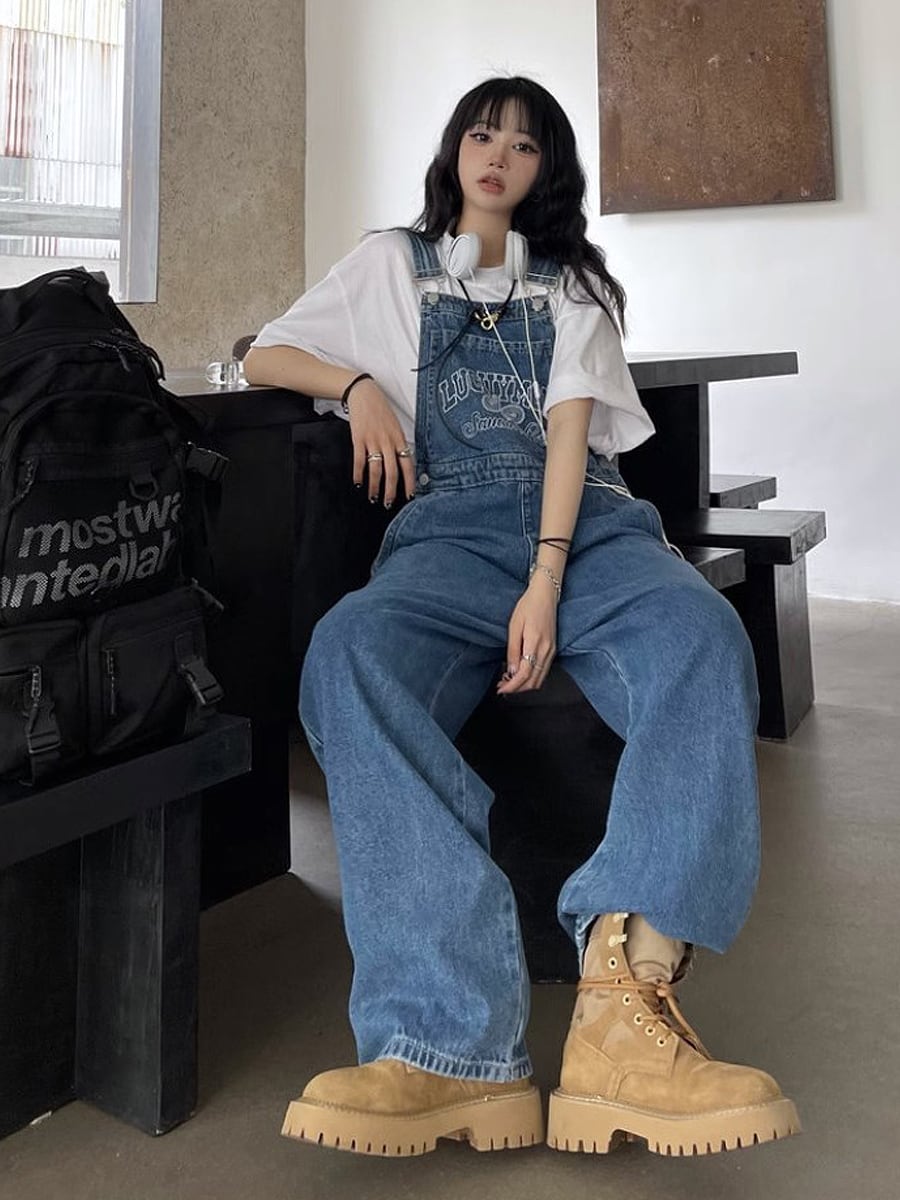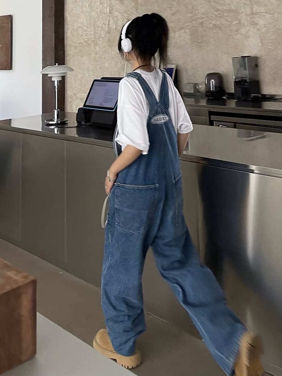 ロゴプリントサロペットデニムロゴプリント 英字 デニム つなぎ サロペット ジャンプスーツ オールインワン オーバーオール カバーオール コンビネゾン ヴィンテージ風 レトロ ビンテージ風 ゆとりあり 動きやすい 楽ちん お家コーデ リラックスタイム くつろぎタイム カジュアル ダメージ ダメージ加工 かっこいい おしゃれ 韓国系 オルチャン 韓国コーデ 韓国ファッション デニムブルー 青 ブルー