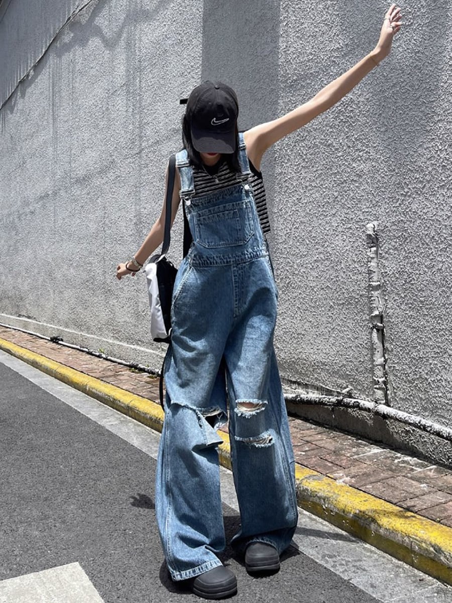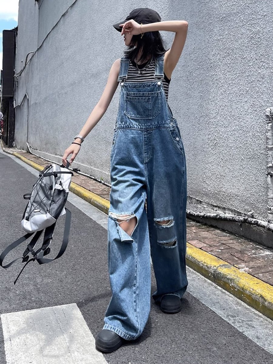 ダメージ加工つなぎ ダメージデニム ダメージサロペットパンツ デニム つなぎ サロペット ジャンプスーツ オールインワン オーバーオール カバーオール コンビネゾン ヴィンテージ風 レトロ ビンテージ風 リップドジーンズ 穴あき 動きやすい 楽ちん お家コーデ リラックスタイム くつろぎタイム カジュアル ダメージ ダメージ加工 かっこいい おしゃれ 韓国系 オルチャン 韓国コーデ 韓国ファッション デニムブルー 青 ブルー
