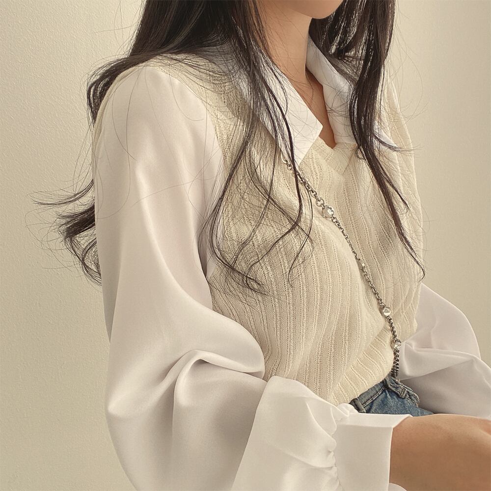 ぱっと見【ブラウスにベスト】のように見えますが、異なる材質を組み合わせ、一枚のプルオーバーになっています。