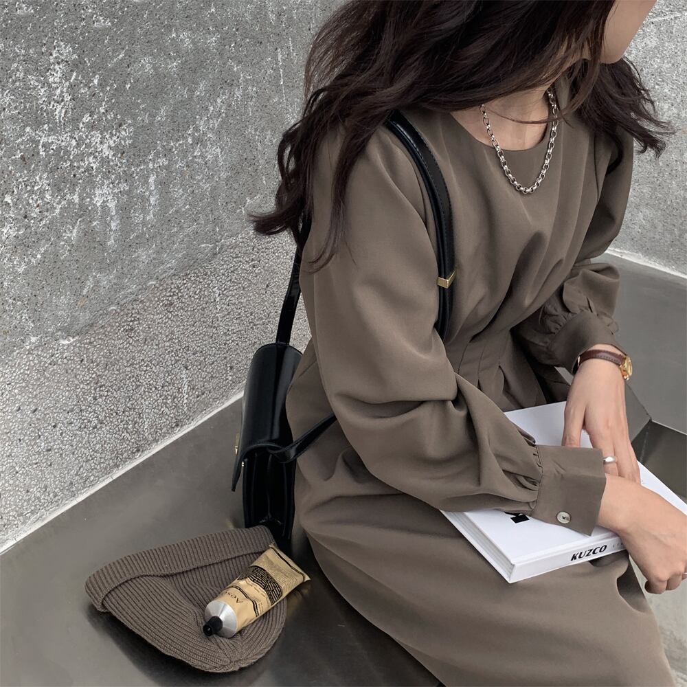タックワンピース ウエストタック バッリボン 長袖 楽ちん 動きやすい ワンピース 膝下 ミモレ丈 ウエストマーク Aライン ウエストマーク ウエストゴム 大きなサイズ かわいい 大人可愛い きれいめ シンプル カジュアル 大人 上品 おしゃれ お洒落 かっこいい レトロ 大人女子 こなれ感 クール エレガント 無地 春 秋 冬 レディース ビジネス OL 通勤 学生 通学 デート 普段使い モテ 美脚 ブラウン 韓国コーデ 韓国ファッション 茶色 M L LL 3L 4L 5L