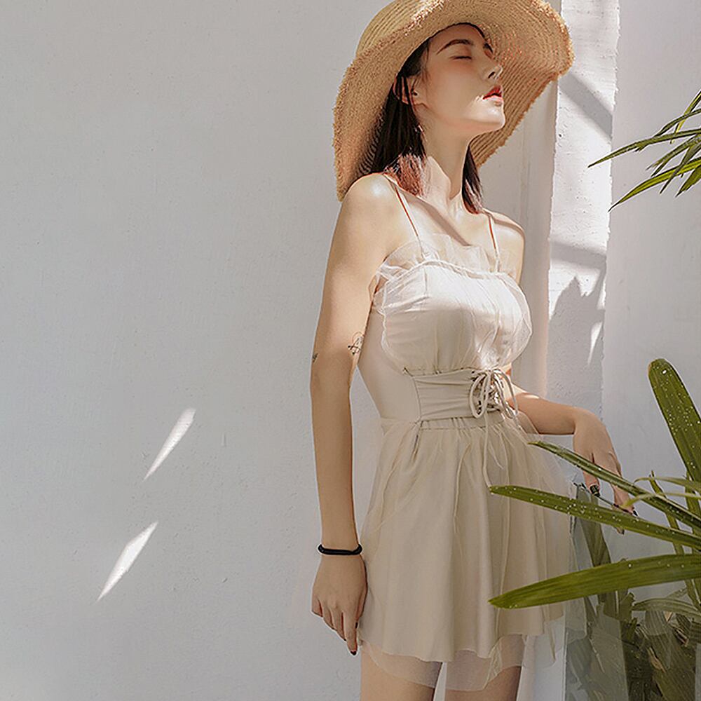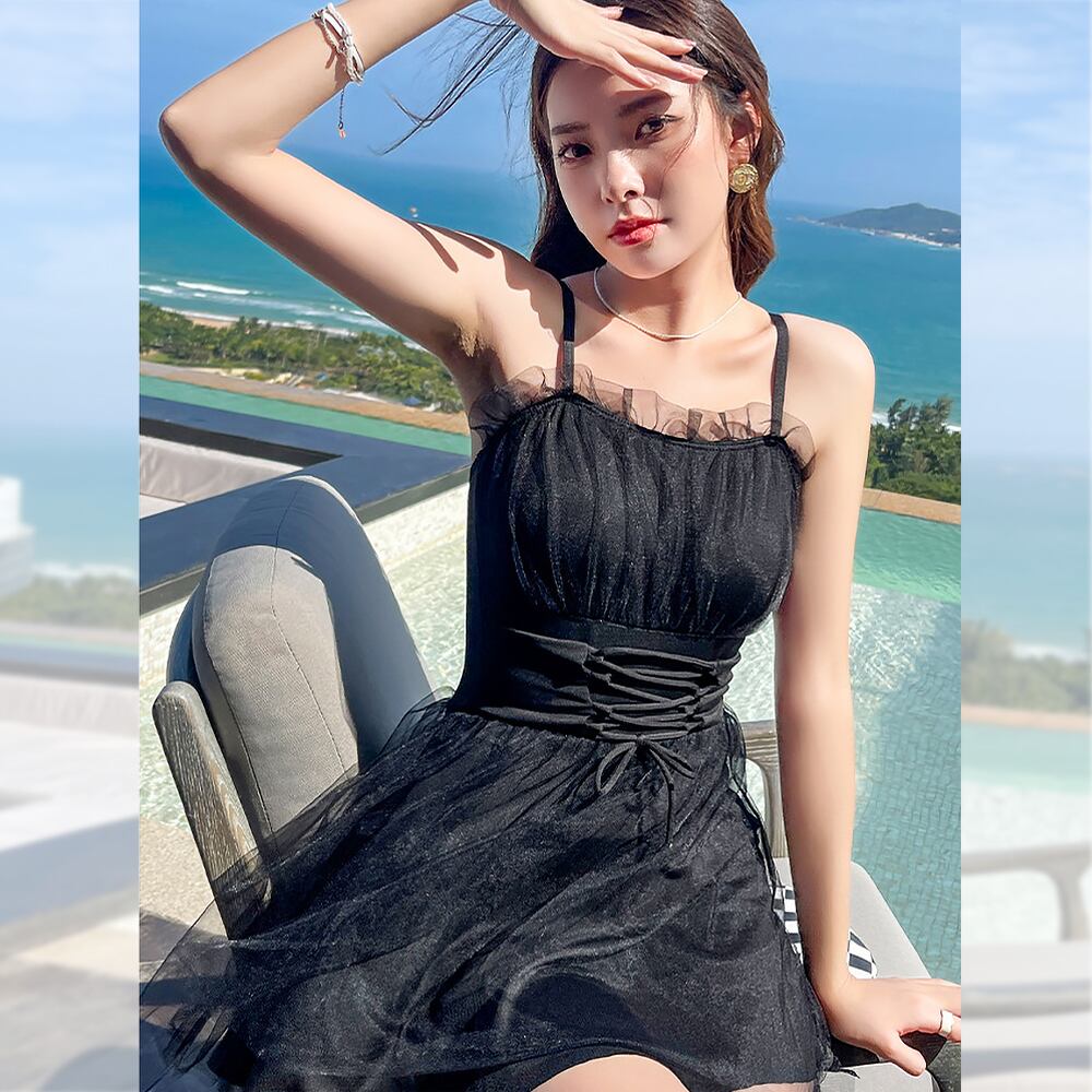 全2色 水着 ワンピース レースアップ 編上げ コルセットベルト ハイウエスト チュール ウエスト細見え 胸元フリル フリル プリンセス きれいめ フェミニン かわいい 胸元くしゅくしゅ 胸パッド付き ワイヤーなし フレアスカート スカート付き レトロデザイン コルセット風 伸縮性 オールインワン 紐 個性的 かわいい 大人可愛い きれいめ セクシー sexy 華やか おしゃれ リゾート バカンス 海 プール スタイリッシュ 美脚 脚長 韓国コーデ 韓国ファション スイムウェア