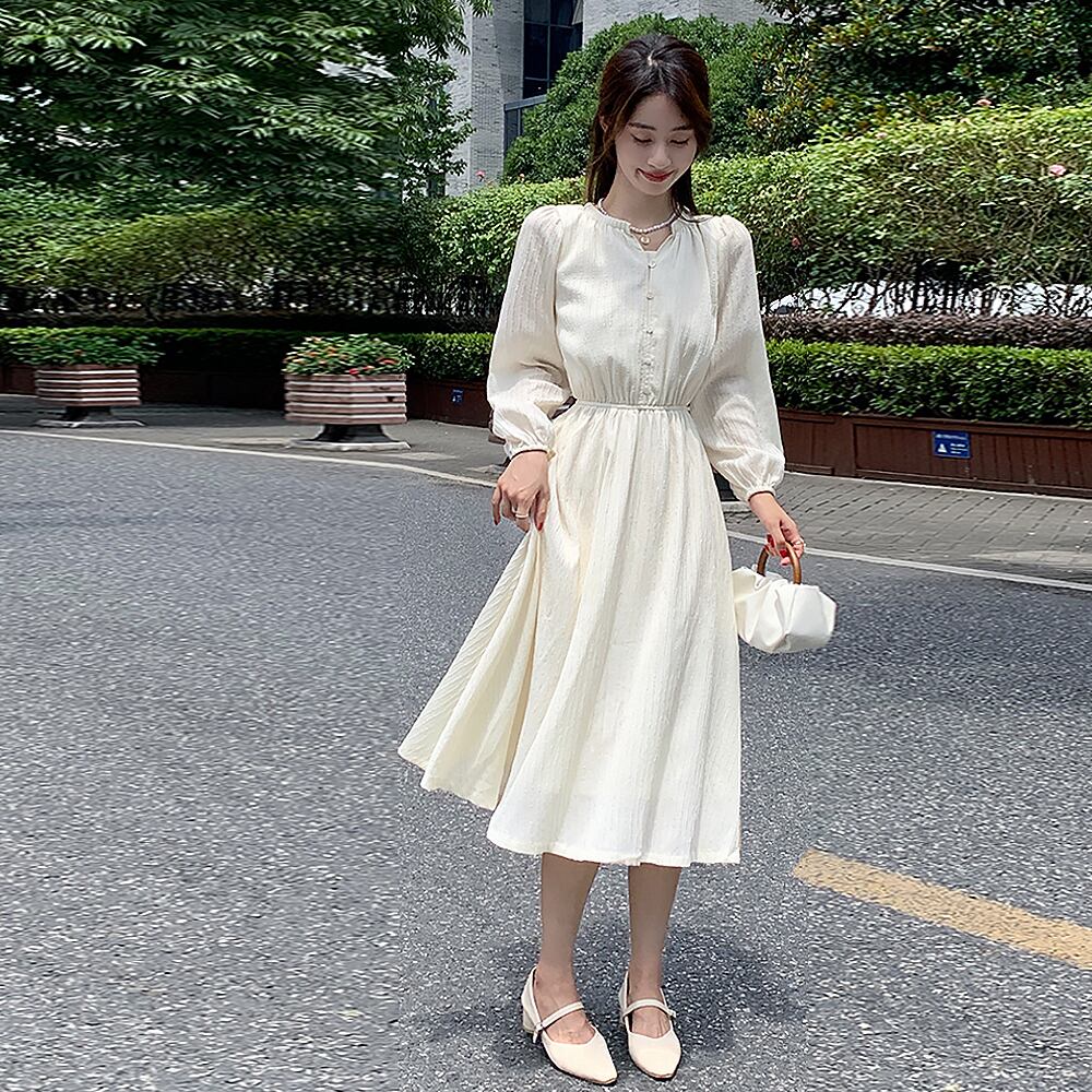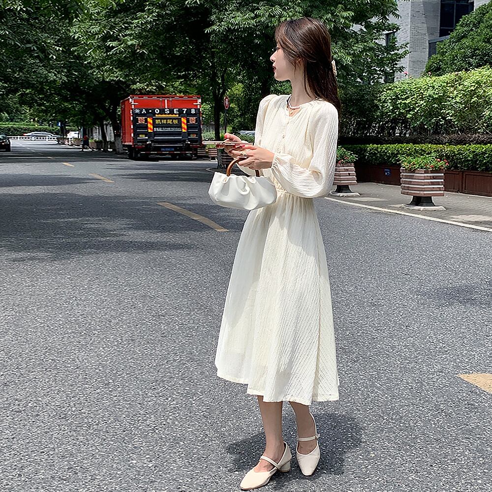 長袖ワンピース デート フレアワンピース ウエストマーク シフォンワンピース ウエストギャザー ボタン ワンピドレス ミモレ ロング 袖あり 長袖 ボリューム袖 パフスリーブ フレアスリーブ ホルンスリーブ ラウンドネック クルーネック 襟なし フレア セミフレア Aライン 切り替えデザイン ウエストマーク 透け感 伸縮性 薄手 かわいいきれいめ シンプル 上品 おしゃれ お洒落 大人女子 こなれ感 ラブリー キュート ガーリー エレガント 韓国コーデ 韓国ファッション アイボリー