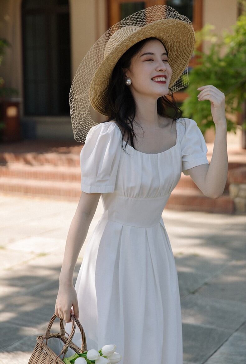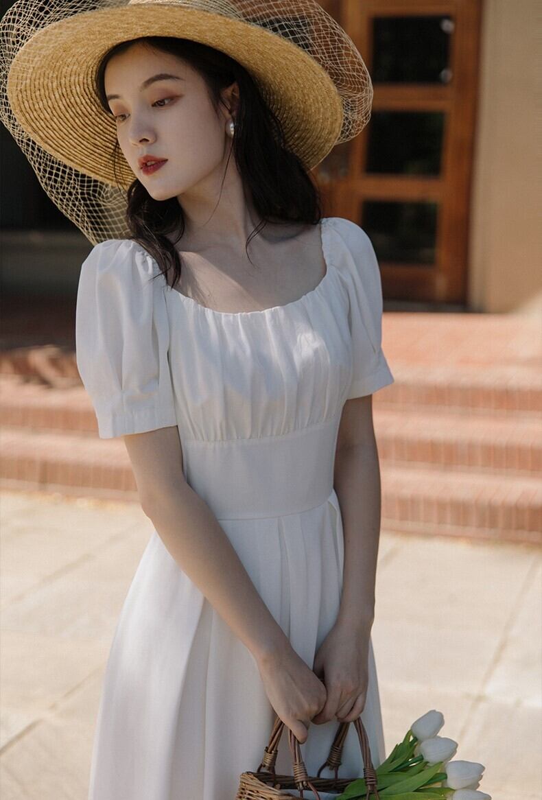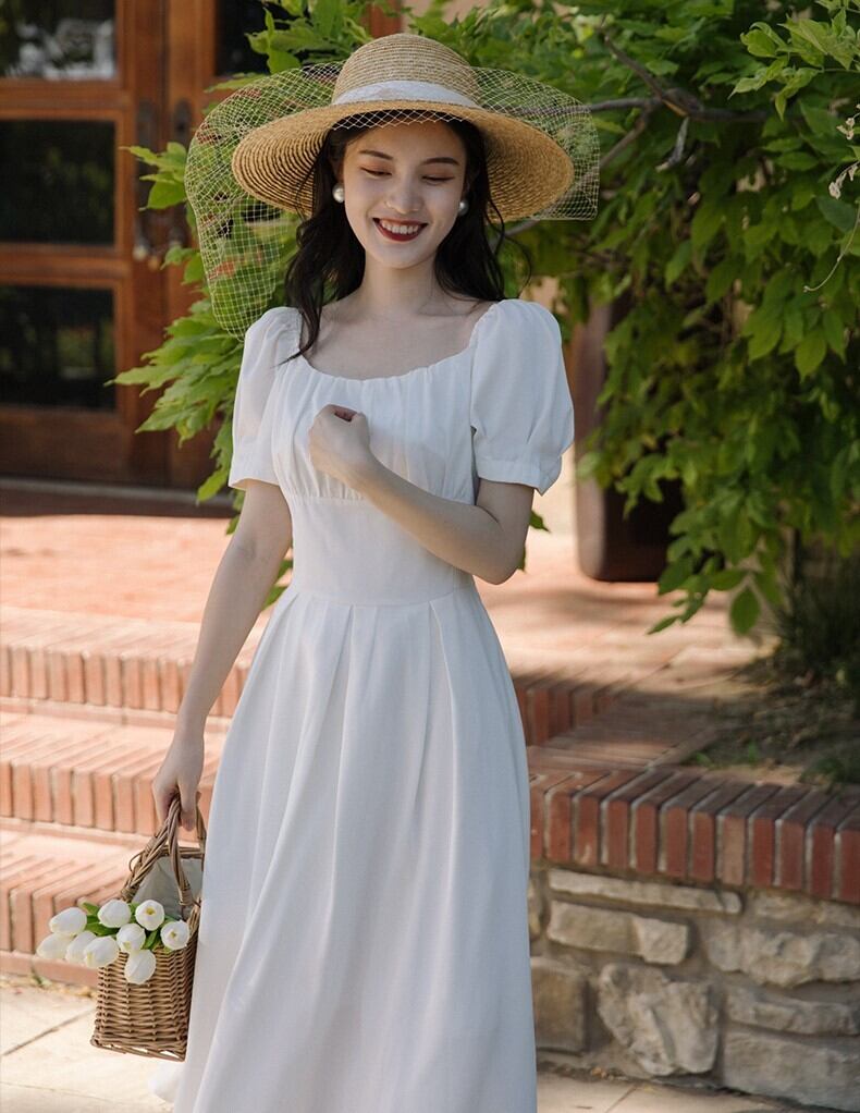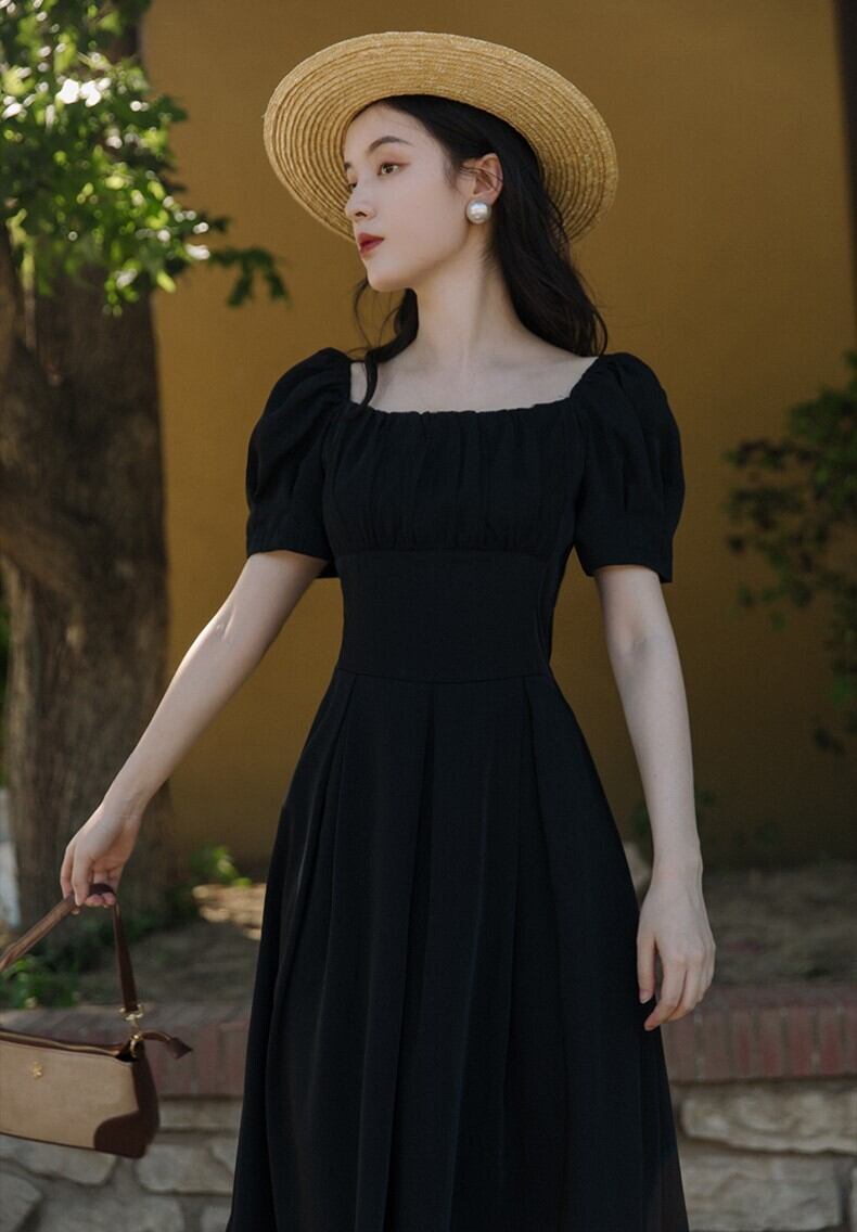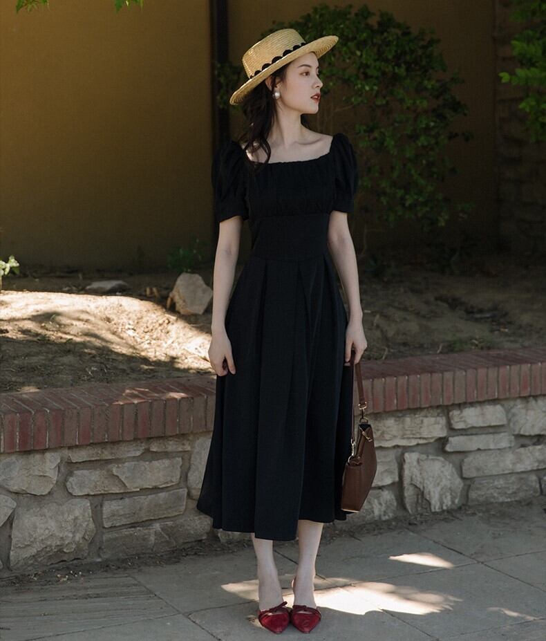 全2色 ワンピース サマードレス 袖タック 幅広ウエスト切替え デコルテ見せ 膝下 ミモレ丈 ミディアム丈 半袖 パフスリーブ ボリューム袖 襟なし スクエアネック タックフレア Aライン バックリボン バックコンシャス ハイウエスト かわいい 大人可愛い シンプル きれいめ カジュアル 上品 おしゃれ 無地 春 夏 レディース 女の子 デート 旅行 リゾート 休日 普段使い 韓国系 オルチャン S M L XL 白 赤 黒 韓国コーデ 韓国ファッション
