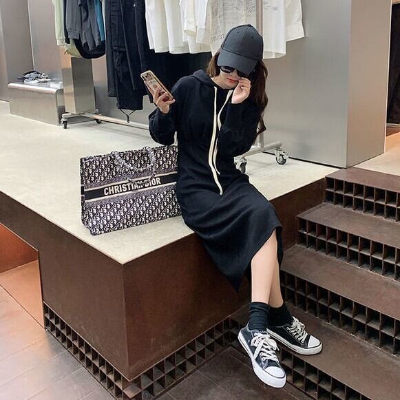 全2色 スウェットワンピース ギャザー切替え スタイルアップ フーディワンピ スウェットワンピース ワンピース ひざ丈 膝下 ミディアム丈 長袖 ドロップショルダー Iライン 切り替えデザイン バックスリット フード付き ハイウエスト かわいい シンプル カジュアル おしゃれ スポーティー レディース 学生 通学 デート お出かけ 着回し 普段使い 重ね着 韓国系 オルチャン ファッション コーデ スタイル 脚長 S M L XL 黒 ブラック 灰色 グレー 韓国コーデ 韓国ファッション