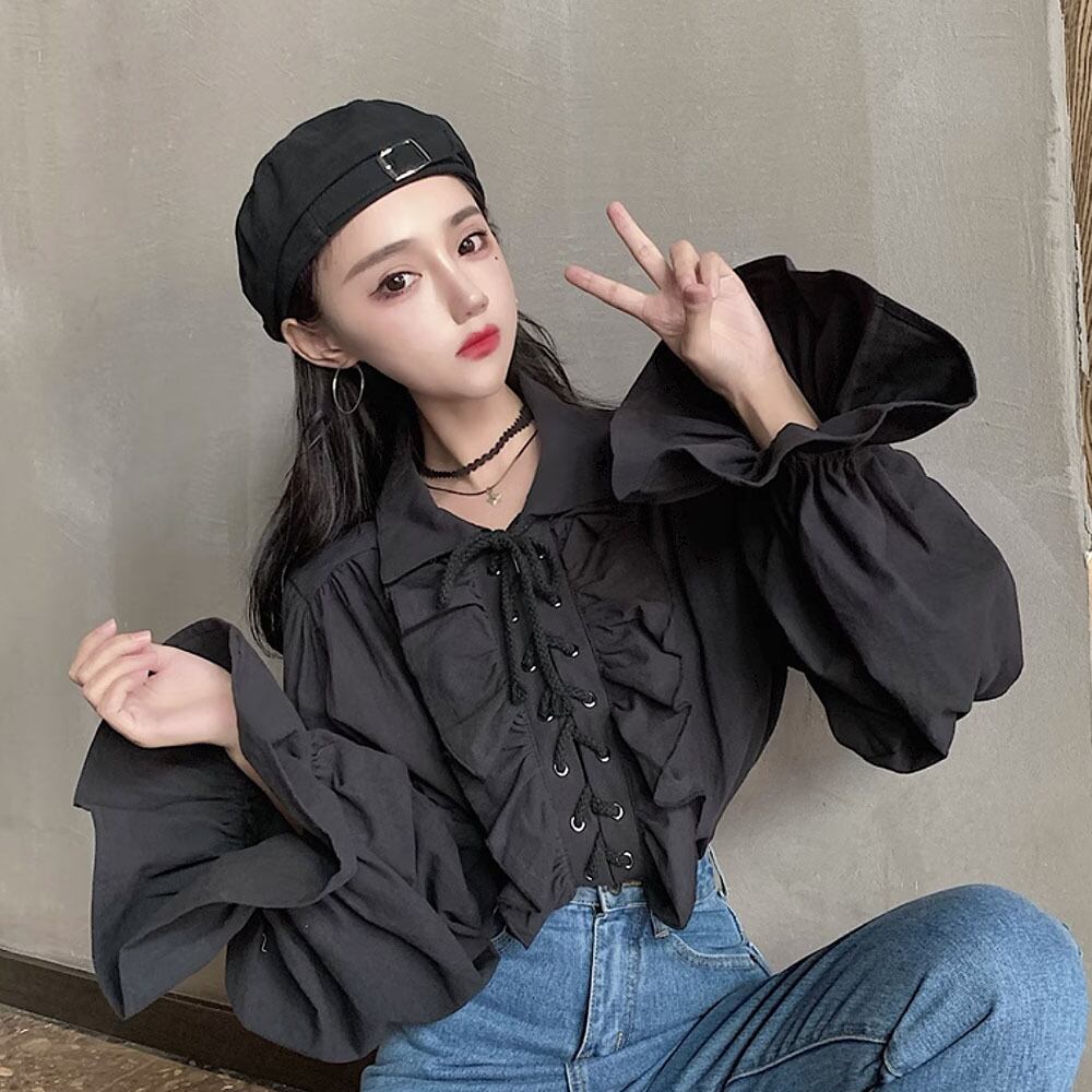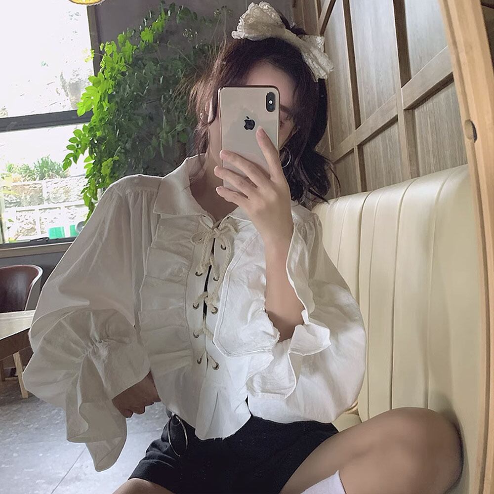 全2色 長袖ガーリーレースアップブラウス ホワイト ブラック 白 黒 フリル レースアップ 編み上げ バルーンスリーブ トランペットスリーブ 襟あり 長袖 ゆったり 大きめ ルーズ かわいい 大人可愛い きれいめ シンプル カジュアル 大人 かっこいい レトロ 大人可愛い 大人女子 こなれ感 ラフ ラブリー キュート ガーリー 個性的 レディース OL 通勤 学生 通学 デート 休日 運動 リゾート 旅行 体系カバー 韓国コーデ 韓国ファッション