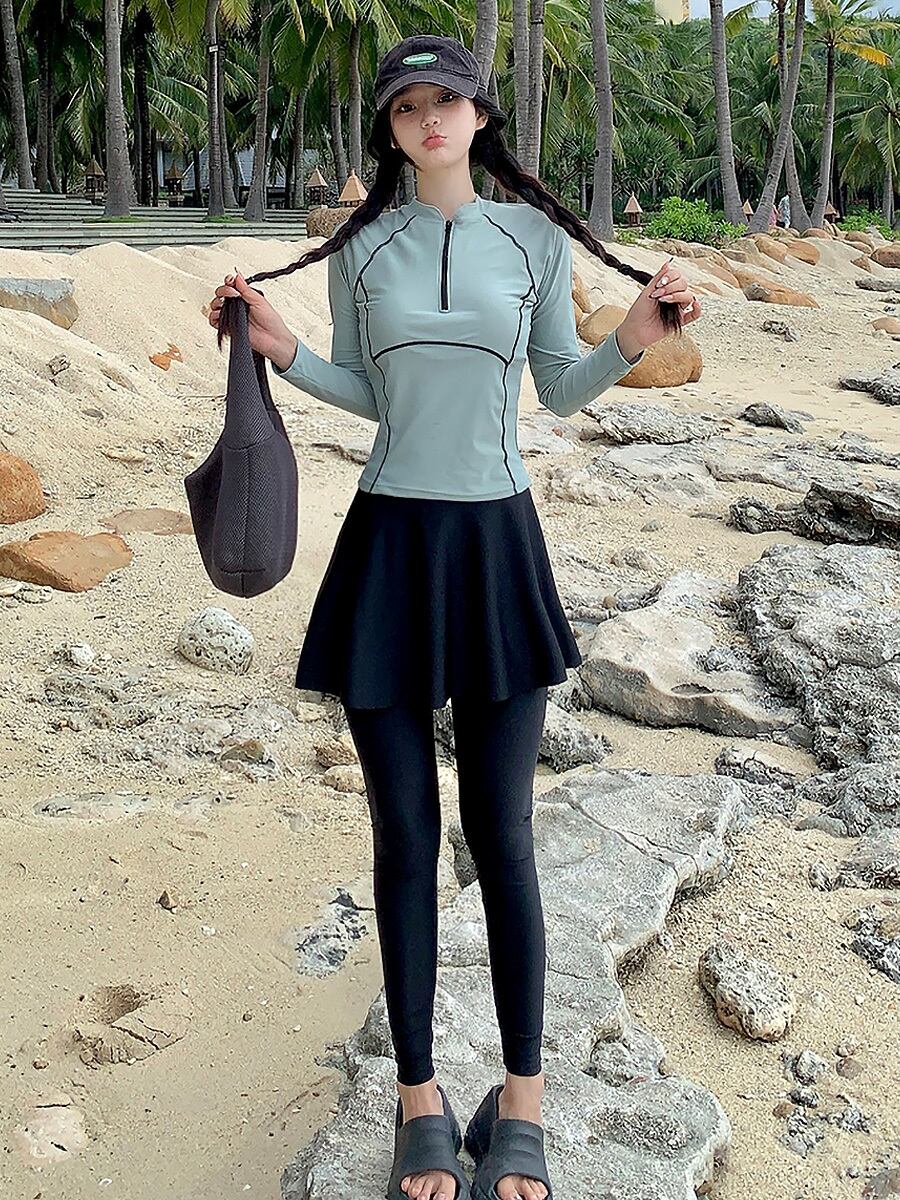 水着 長袖 ハーフジップアップスカート付きロングパンツ スポーティセパレート水着 ダイビングスーツ ファスナー ハーフジップ ドッキングフレアスカート ツーピース ダイビング セパレート 長袖 ラッシュガード水着 ミニスカート フレア フィットネス フレアスカート グリーン 黒 緑 くすみグリーン ラッシュガード スポーティ 水遊び きれいめ かわいい パッド付き ノンワイヤー かわいい 大人可愛い きれいめ おしゃれ スタイリッシュ スイムウェア