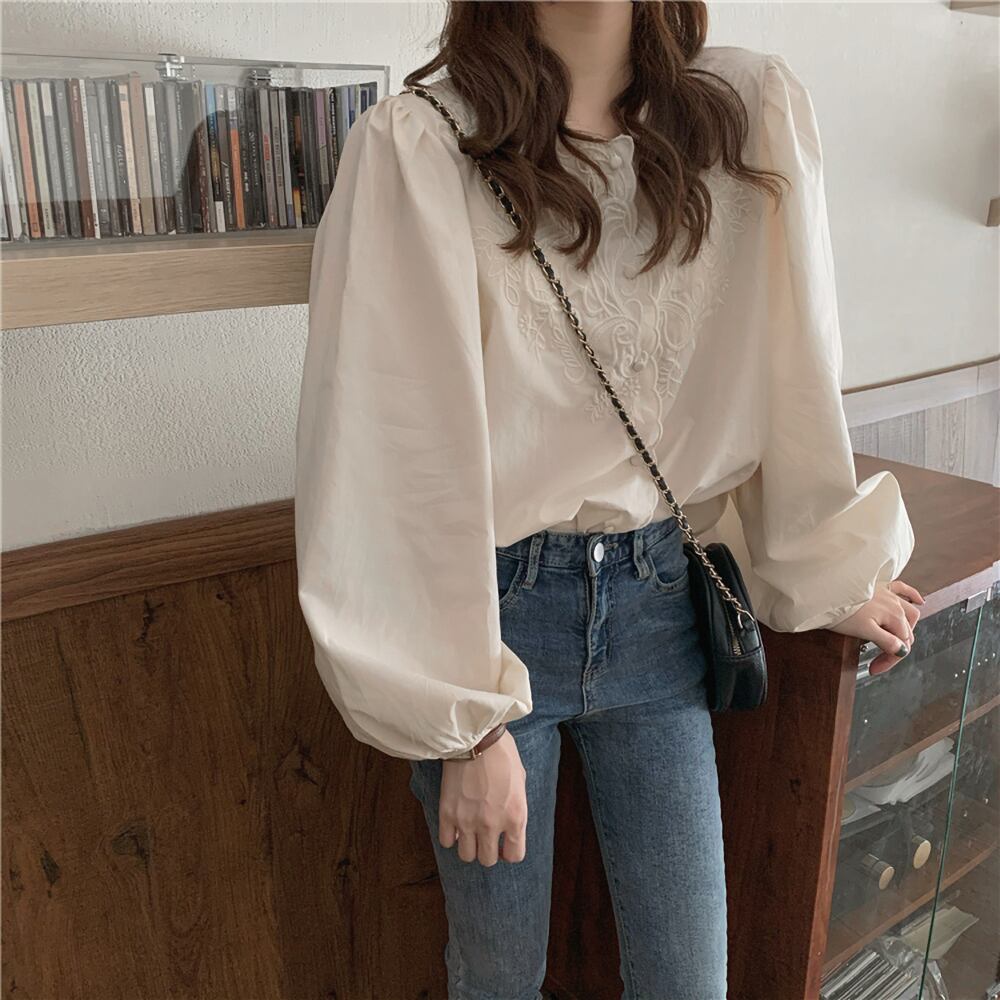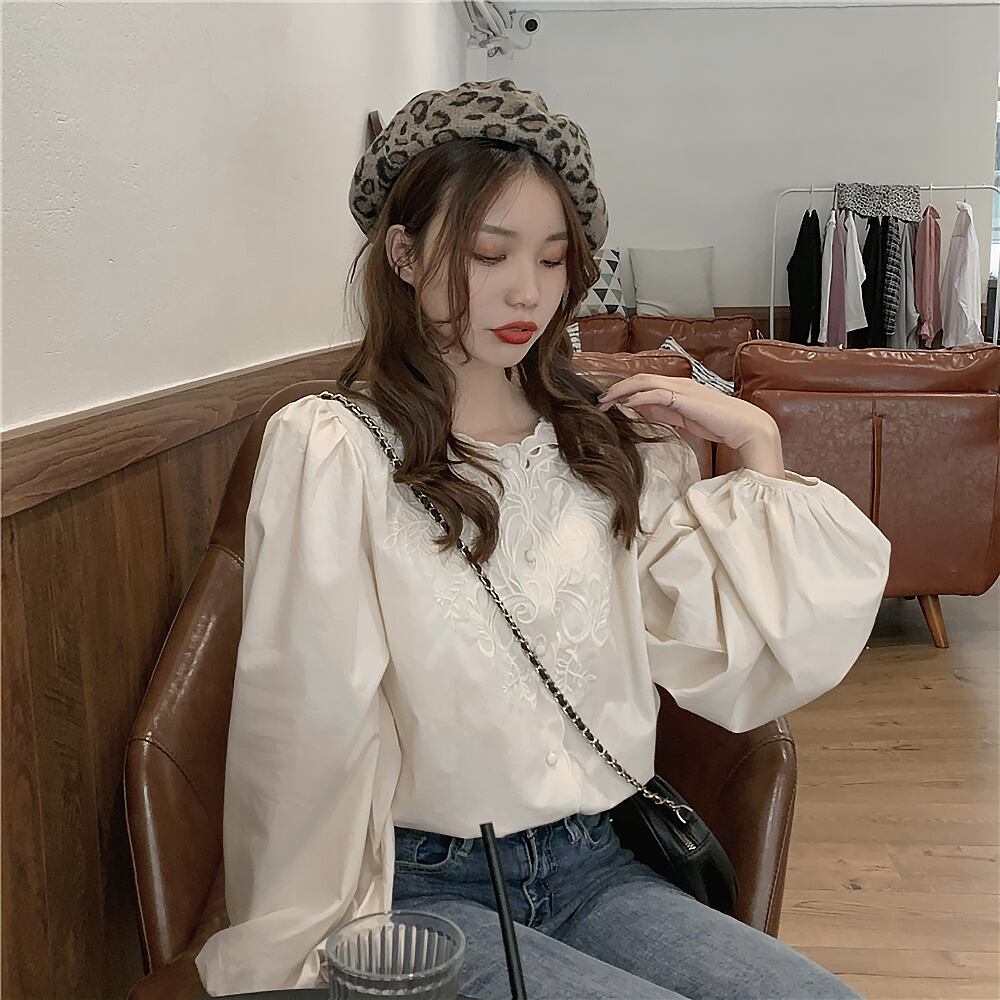 刺繍シャツ 長袖 ブラウス ボリュームスリーブ ランタンスリーブ 襟なし シャツ シャツブラウス くるみボタン オフホワイト アイボリー ふんわり袖 スカラップ スカラップレース きちんと感 上品 清楚 スーツにも かわいい 大人可愛い きれいめ シンプル カジュアル 大人 おしゃれ 大人女子 こなれ感 ラフ キュート セクシー エレガント 主役級 存在感 レディース 学生 通学 デート 通勤 着回し 普段使い 韓国 オルチャン 韓国コーデ 韓国ファション