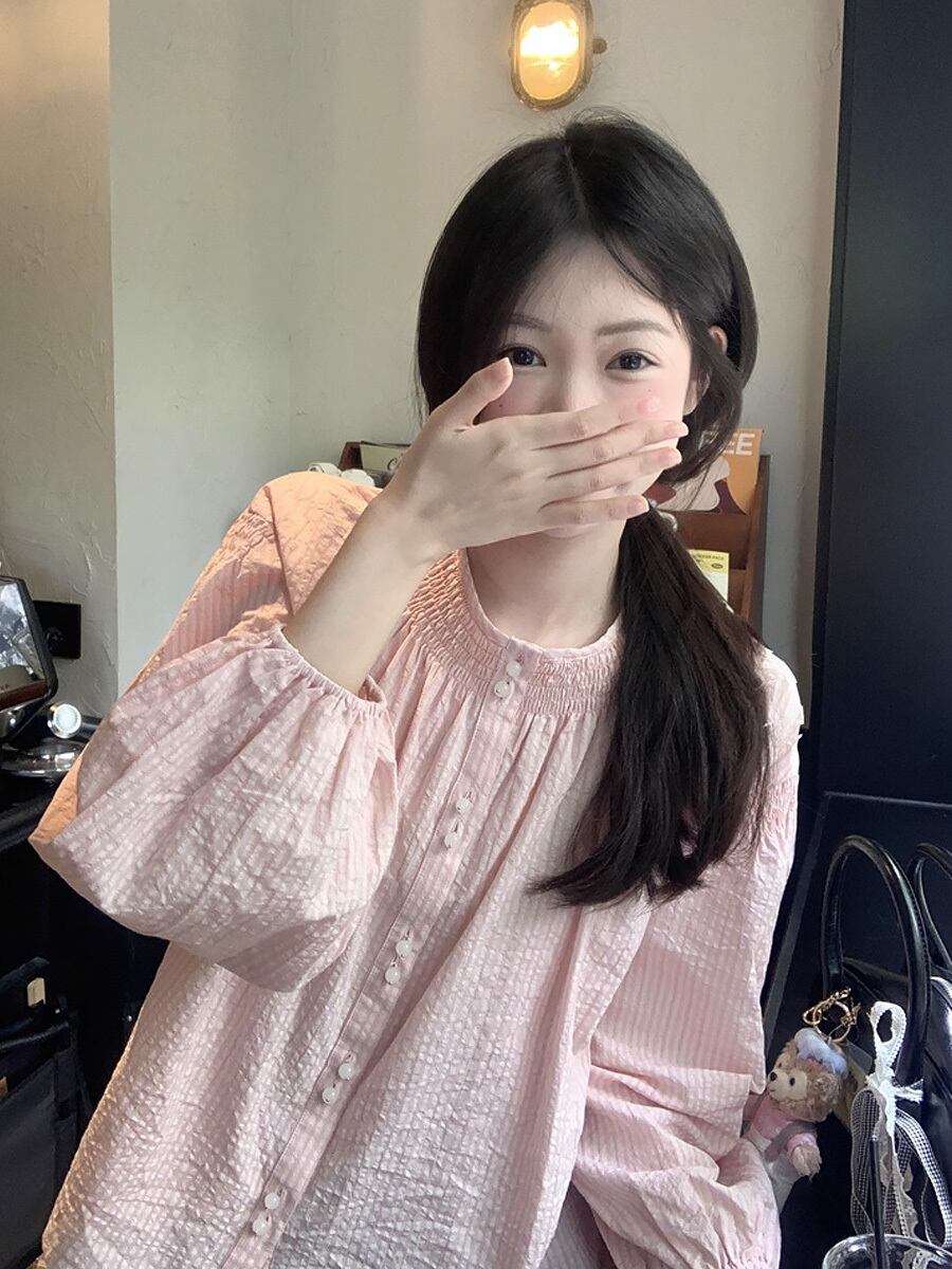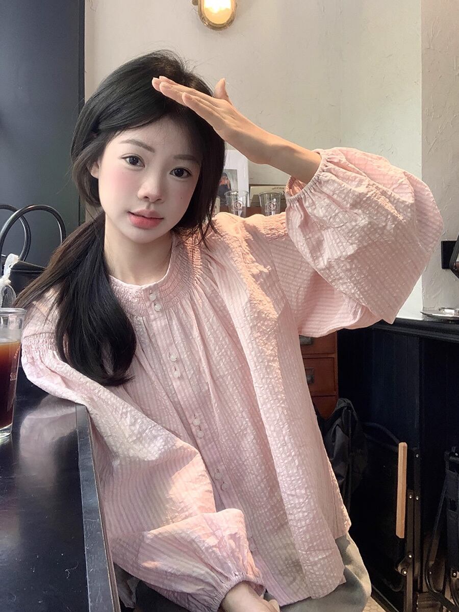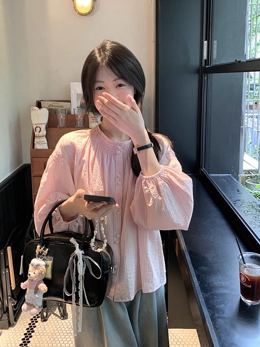 ピンクストライプ柄ノーカラースモッグ風ブラウス 長袖シャツ ブラウス ミディアム丈 袖あり 長袖 ボリューム袖 ぽわん袖 ノーカラー パフスリーブ フレアスリーブ 萌袖 シャーリング 襟ぐりシャーリング ダウンスリーブ 前開き ストライプ シマシマ 縞模様 かわいい 大人可愛い きれいめ ストライプ 上品 おしゃれ お洒落 レトロ 大人女子 こなれ感 ラフ ラブリー キュート ガーリー 個性的 モダン 主役級 存在感 抜け感 柄 韓国コーデ 韓国ファッション ピンク