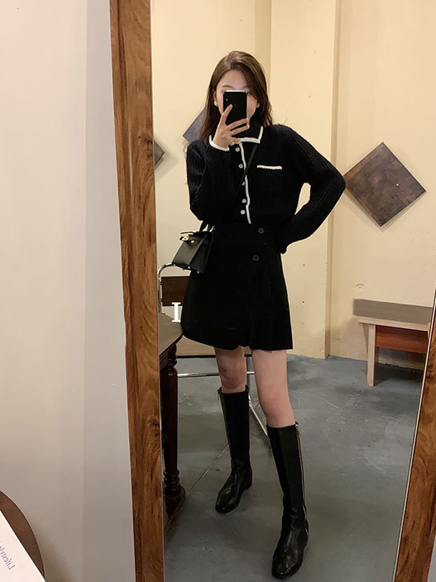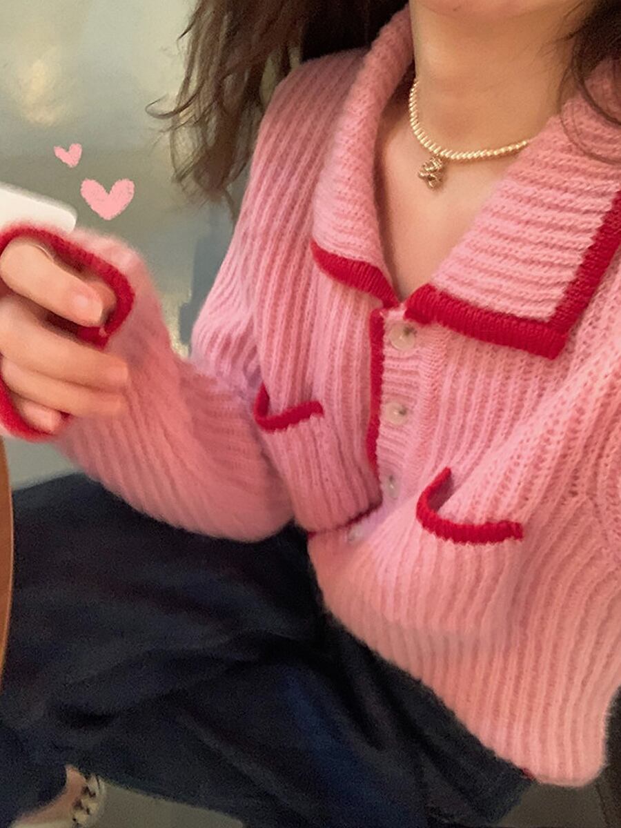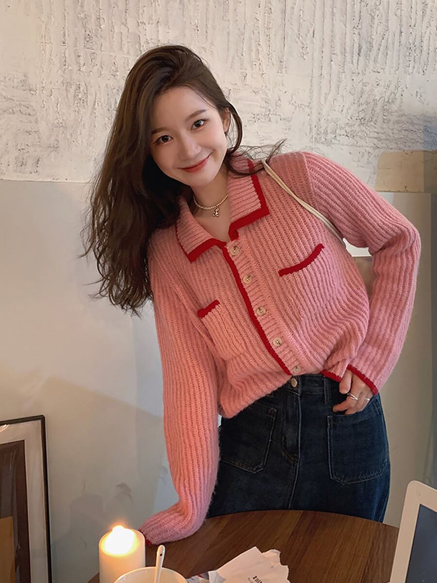 全2色 襟付き 厚手ニット パイピング ボタン ポケット セーター カーディガン ニットジャケット シンプル ナチュラル 前開き カジュアル 大人 上品 おしゃれ お洒落 ゆったり ゆる かっこいい こなれ感 モダン コーデ 羽織り 重ね着 前開き ボタン 体型カバー ファッション 主役級 抜け感 無地 春 秋 冬 10代 20代 30代 40代 レディース オフィス ビジネス OL 通勤 学生 通学 デート お出かけ 防寒 S M L 韓国コーデ 韓国ファッション ピンク 黒