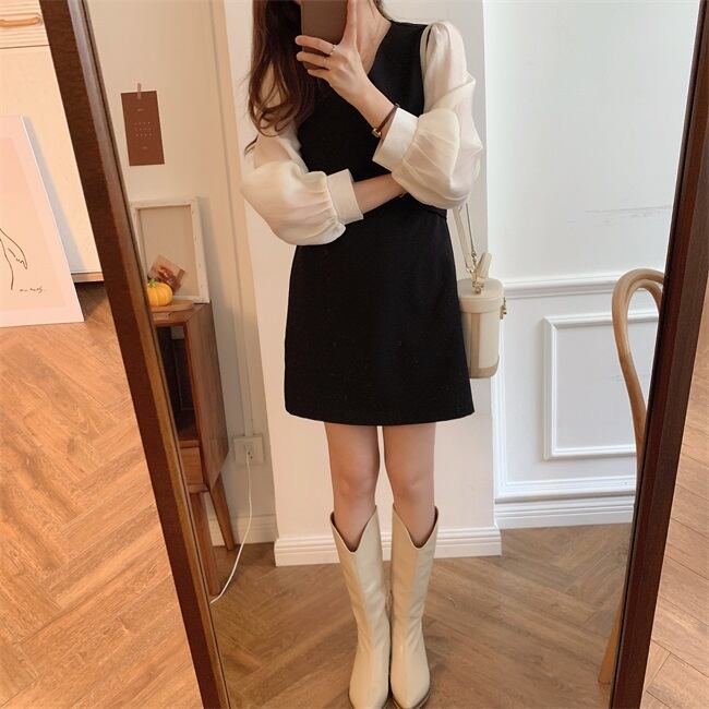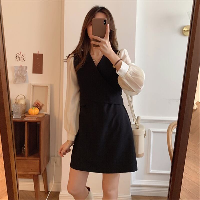 全2色 ドッキングワンピース 重ね着風ワンピース カラー配色 レイヤード風 足見せ ワンピース ワンピドレス 膝上 ミニ丈 ミディアム丈 長袖 パフスリーブ ボリューム袖 襟なし Vネック カシュクール Aライン バックリボン 異素材MIX かわいい 大人可愛い シンプル きれいめ おしゃれ 春 秋 レディース OL 通勤 学生 通学 デート お出かけ 休日 普段使い 重ね着風 韓国系 オルチャン 脚長 S M L XL 黒 ブラック 茶色 ブラウン バイカラー 韓国コーデ 韓国ファッション