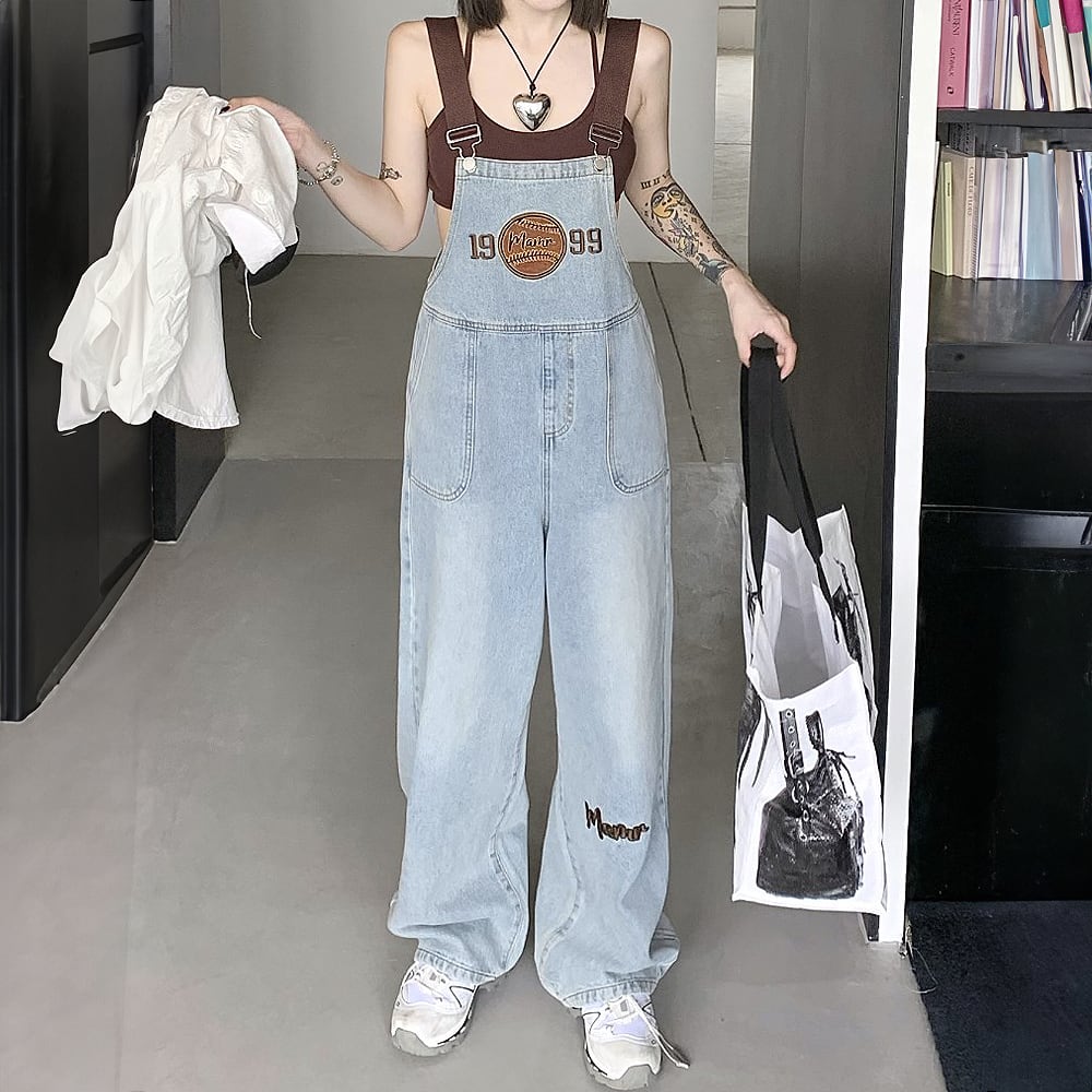 刺繍入りデニムオーバーオール つなぎ ウォッシュ加工 デニム サロペットパンツ デニム つなぎ サロペット ジャンプスーツ オールインワン オーバーオール カバーオール コンビネゾン レトロ アメカジ 刺繍 アップリケ 動きやすい 楽ちん お家コーデ リラックスタイム くつろぎタイム カジュアル かわいい 大人可愛い 可愛い かっこいい おしゃれ 韓国系 オルチャン 韓国コーデ 韓国ファッション ライトブルー